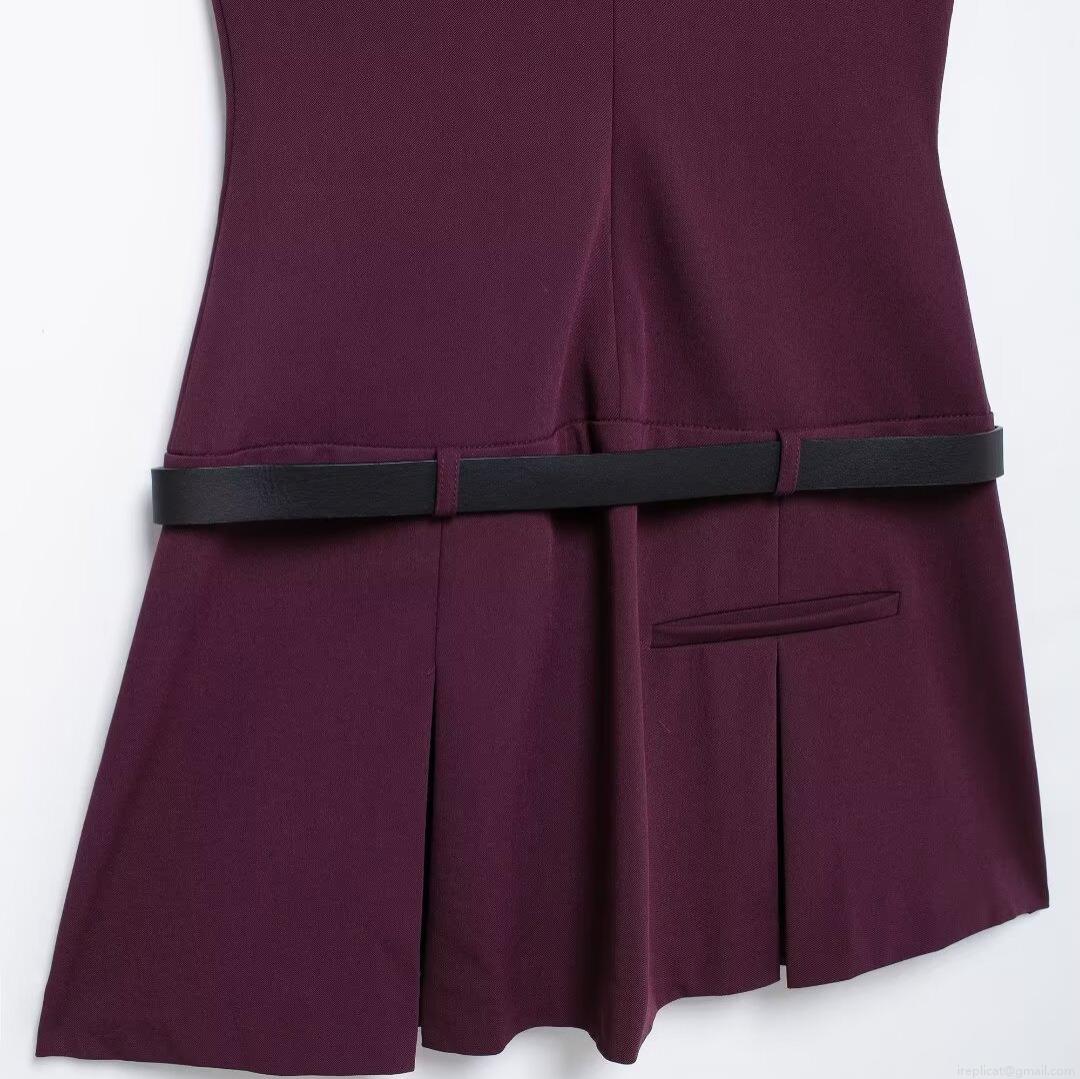 Solid Color, Zipper, Belt, Deep V, Pleated Skirt
