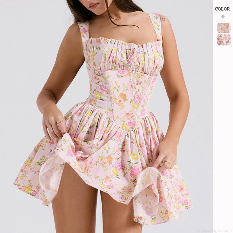 • Women Sexy Floral Mini Dress Summer Spaghetti Strap Corset Bodycon Dress French Cottagecore Backless Flare Skater Sundress Flower Print Sleeveless Party Dress
