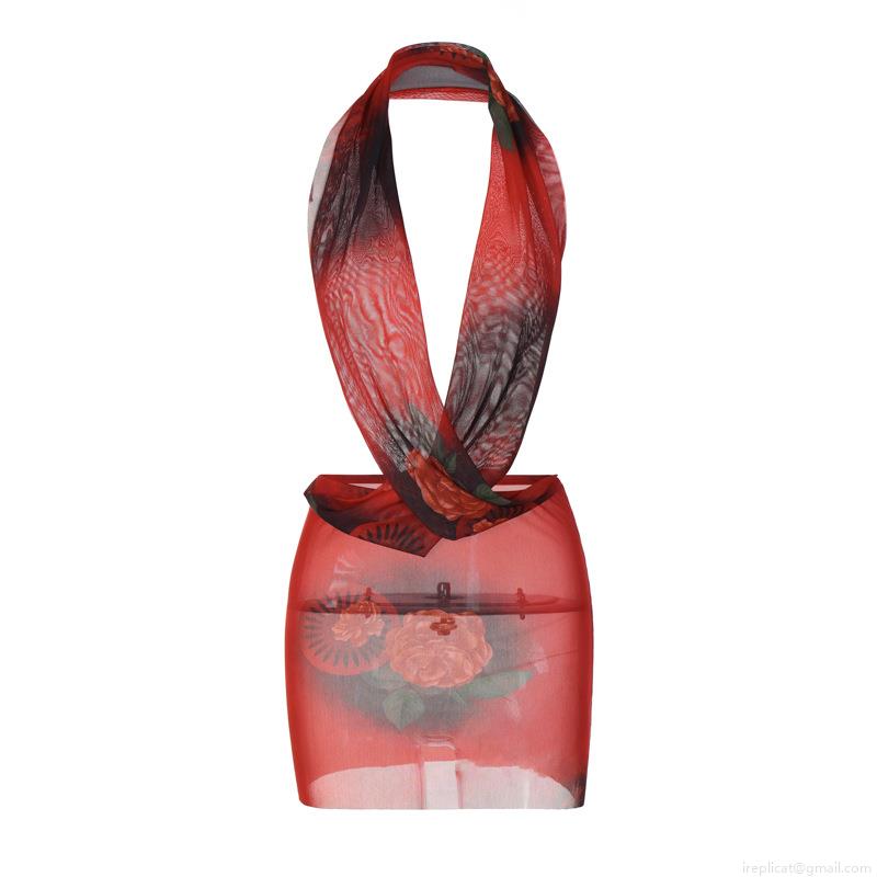 Women Sexy Halter Backless Mini Dress Mesh Red Rose Floral Print Bodycon Party Nightclub Dress 95% Polyester 5% Spandex Sleeveless Clubwear