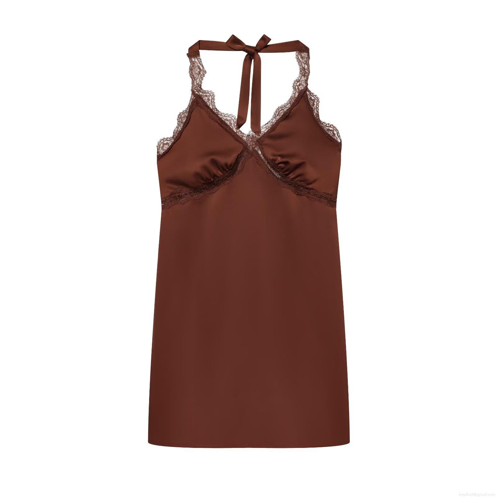 • Women Sexy Halter Satin Lace Patchwork Mini Dress Backless Sleeveless V-Neck Nightgown Clubwear Party Slim Fit Camisole Dress