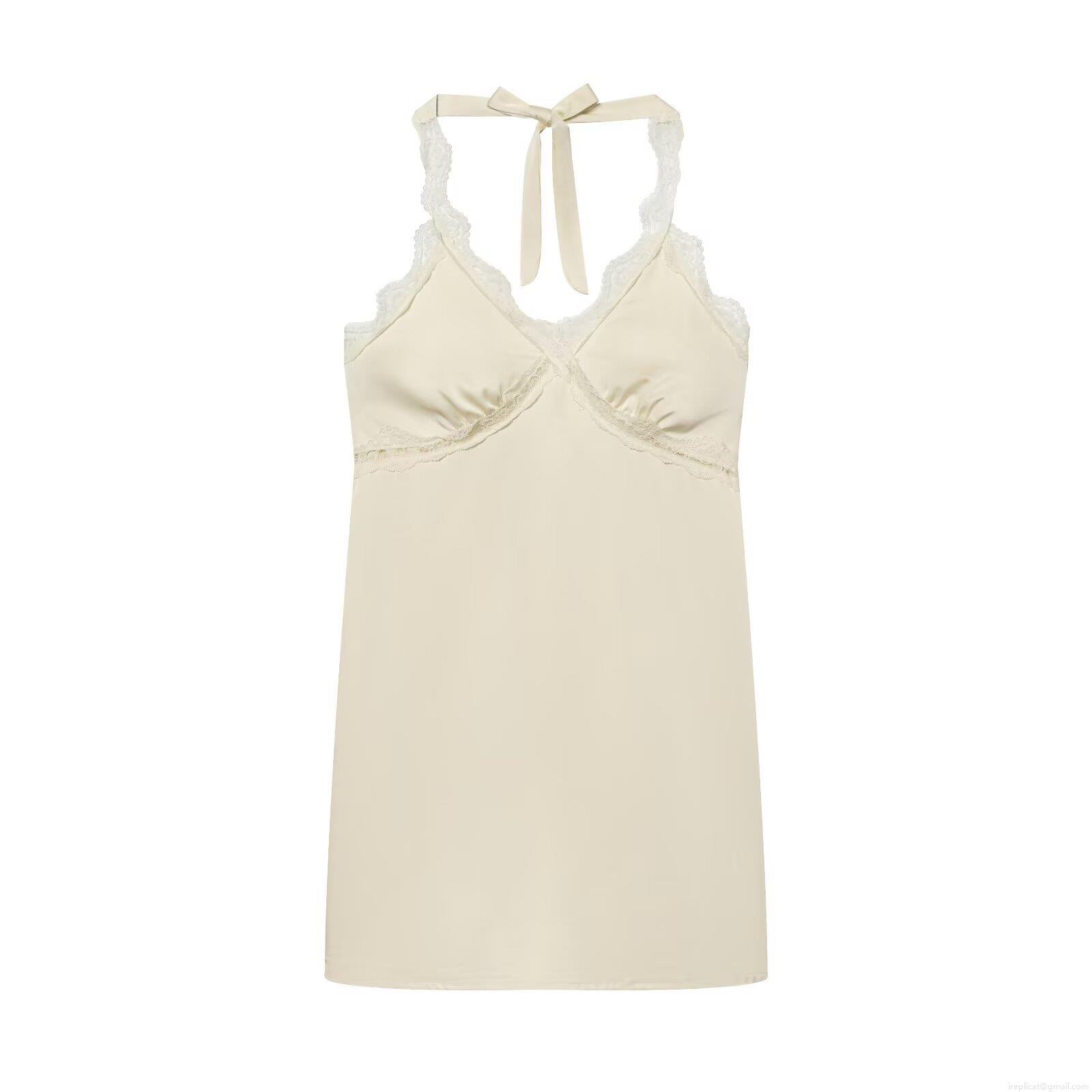 Women Sexy Halter Satin Lace Patchwork Mini Dress Backless Sleeveless V-Neck Nightgown Clubwear Party Slim Fit Camisole Dress