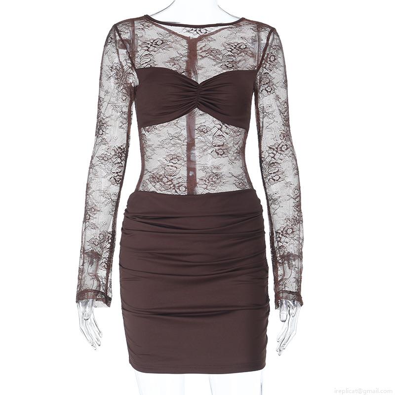 • Women Sexy Lace Patchwork Long Sleeve Mini Dress Ruched Bodycon Club Party Hollow Out Cocktail Dress Elegant Slim Fit Short Dress