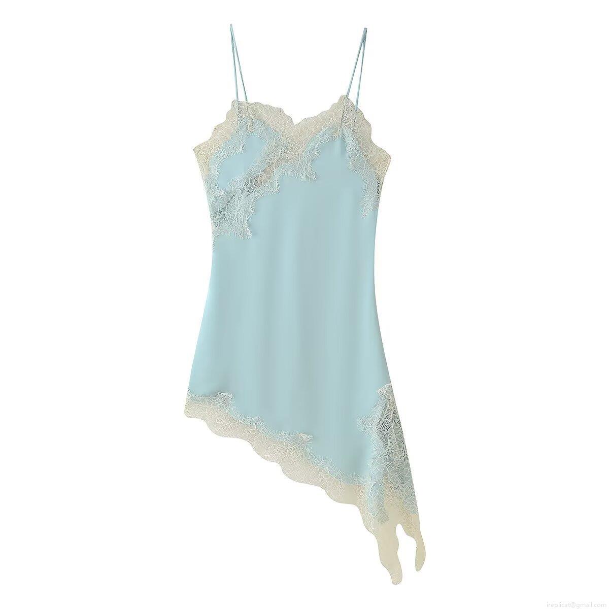 Solid Color, Splice, Lace, V-neck, Thin Straps, Asymmetrical Hem