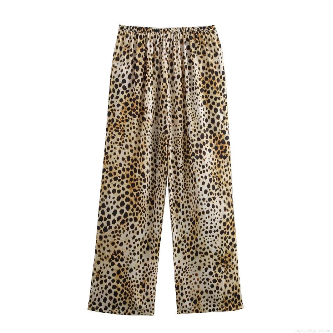 Women Sexy Leopard Print 2 Piece Lounge Set 100% Polyester Satin V-Neck Camisole Top and Wide Leg Drawstring Pants Casual Streetwear Home Outfits