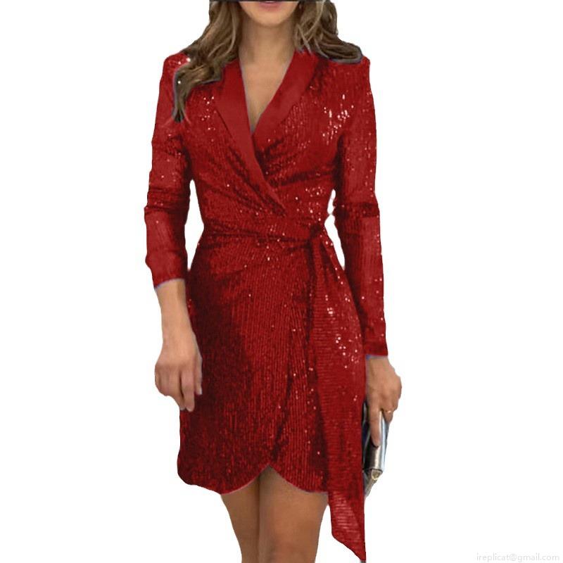 • Women Sexy Sequin Long Sleeve Wrap Dress V Neck Slim Fit Tie Waist Mini Party Evening Wedding Guest Gown Polyester Shiny Sparkle Cocktail Dresses For Lady
