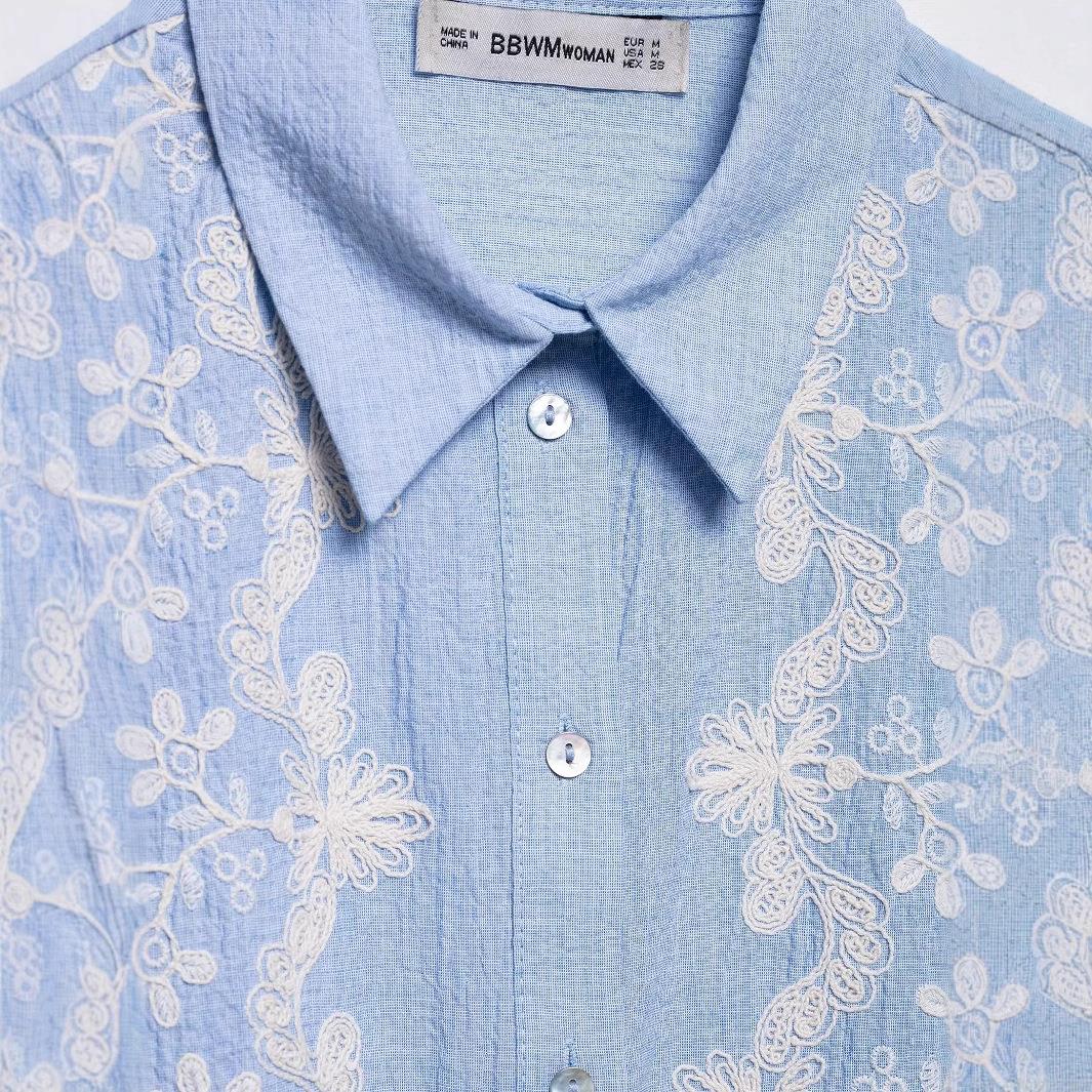 Women Short Sleeve Shirt Floral Embroidery Scalloped Edge Polyester Seersucker Casual European Street Style Lapel Button Down Blouse Top Women Clothing