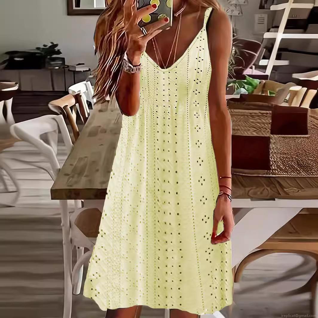 • Women Summer V-Neck Eyelet Embroidery Dress Sleeveless Hollow Out Polyester Spandex Casual Mini Dress For Vacation Beach Daily Wear