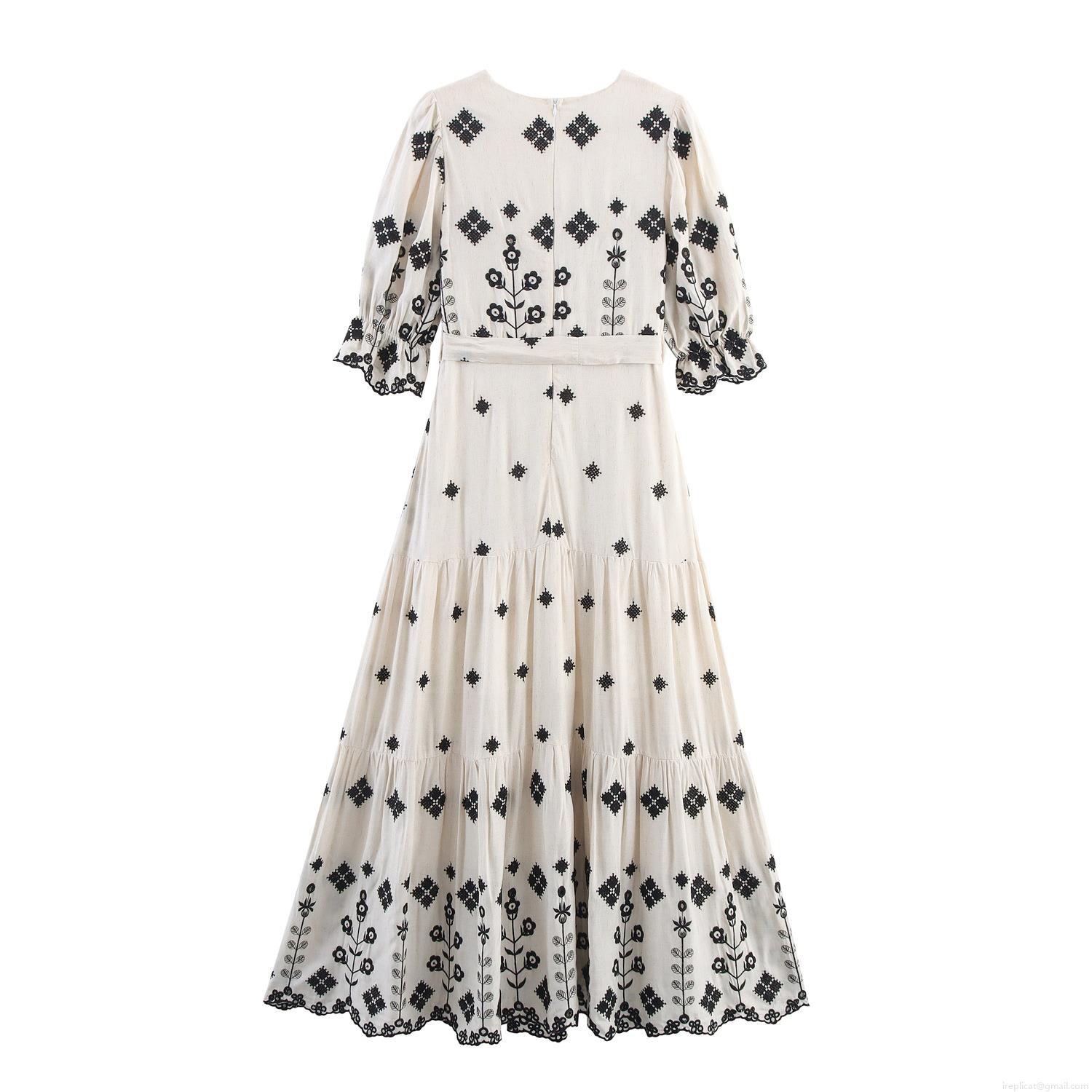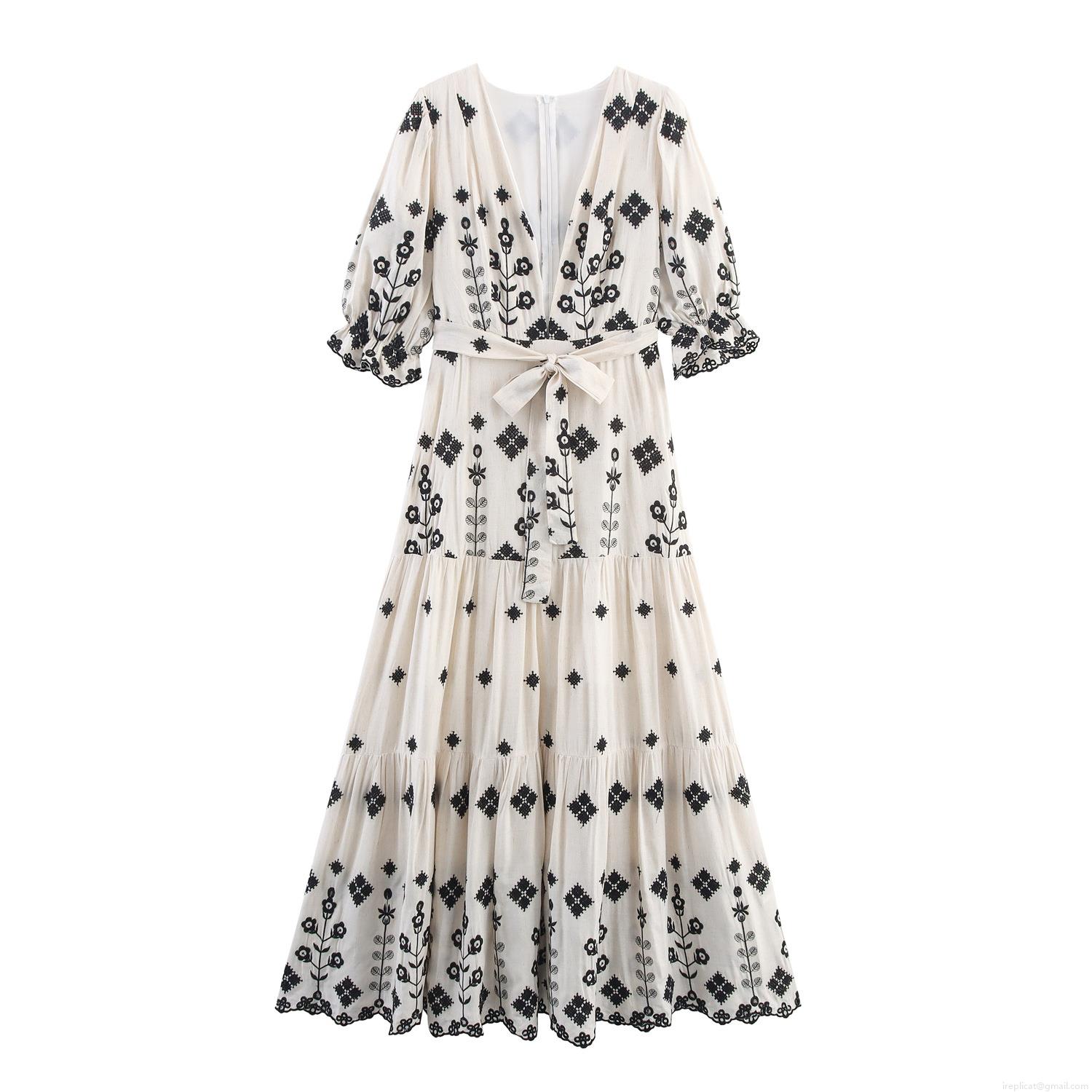 • Women V-Neck Embroidered Maxi Dress Bohemian Ethnic Style Lantern Sleeve Tiered Long Dress With Waist Tie Casual Vacation Beach Gown