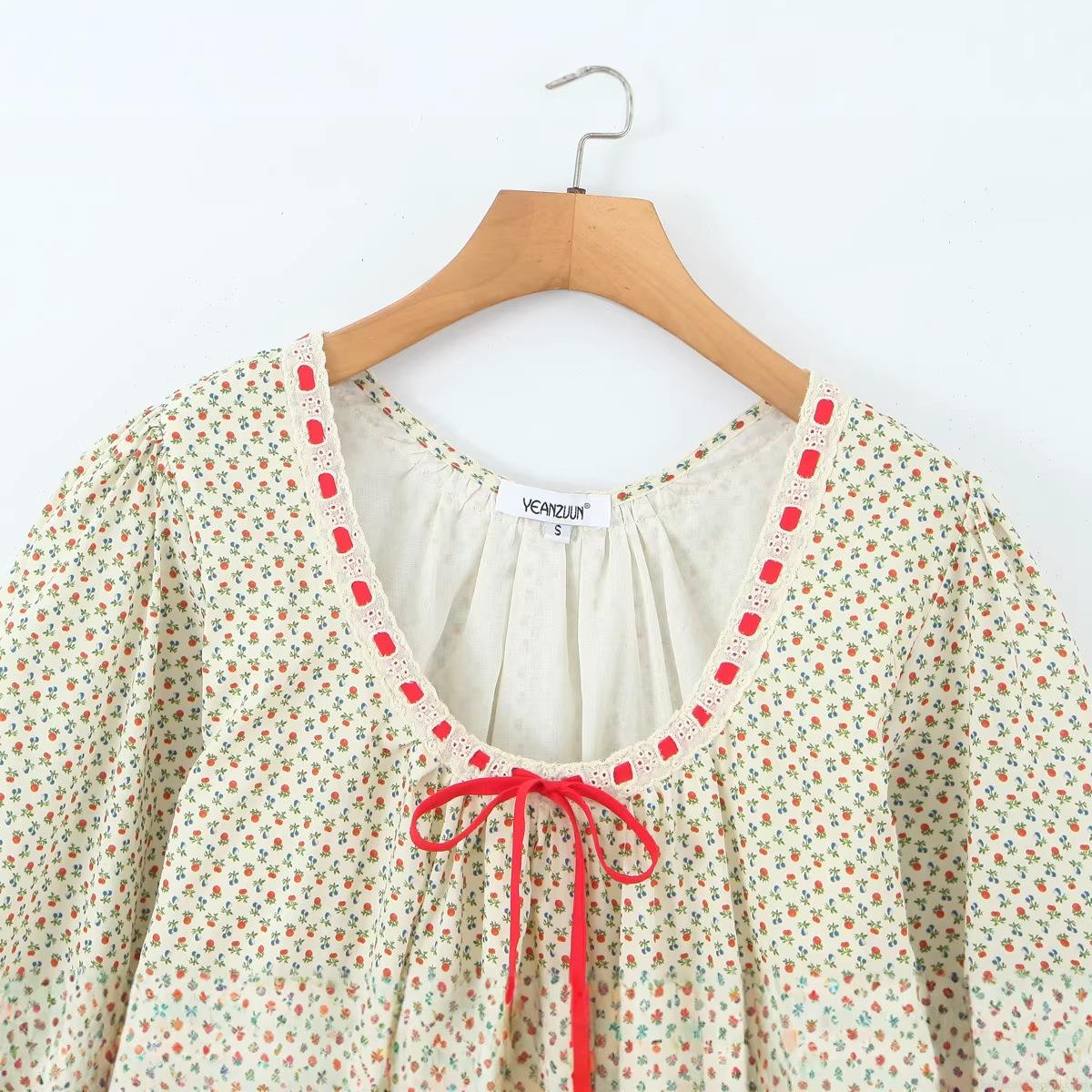 Bow, Floral Pattern, Pleats, Lace, Lantern Sleeves, Red Berry Pattern