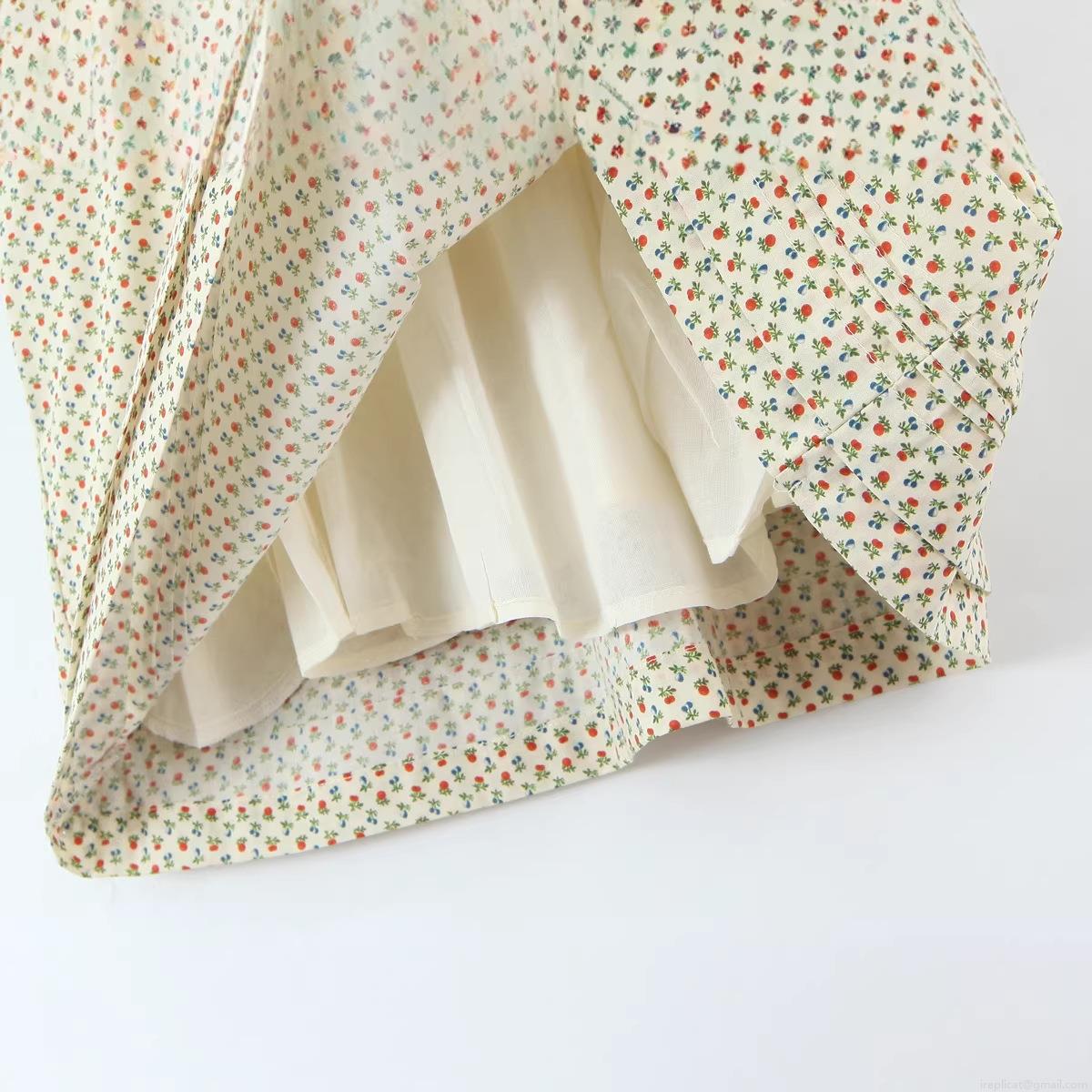 • Women's 100% Cotton Floral Midi Dress Red Berry Print Round Neck Lantern Sleeve Cottagecore Casual Summer Beige Short Sleeve A-Line Dress With Bow