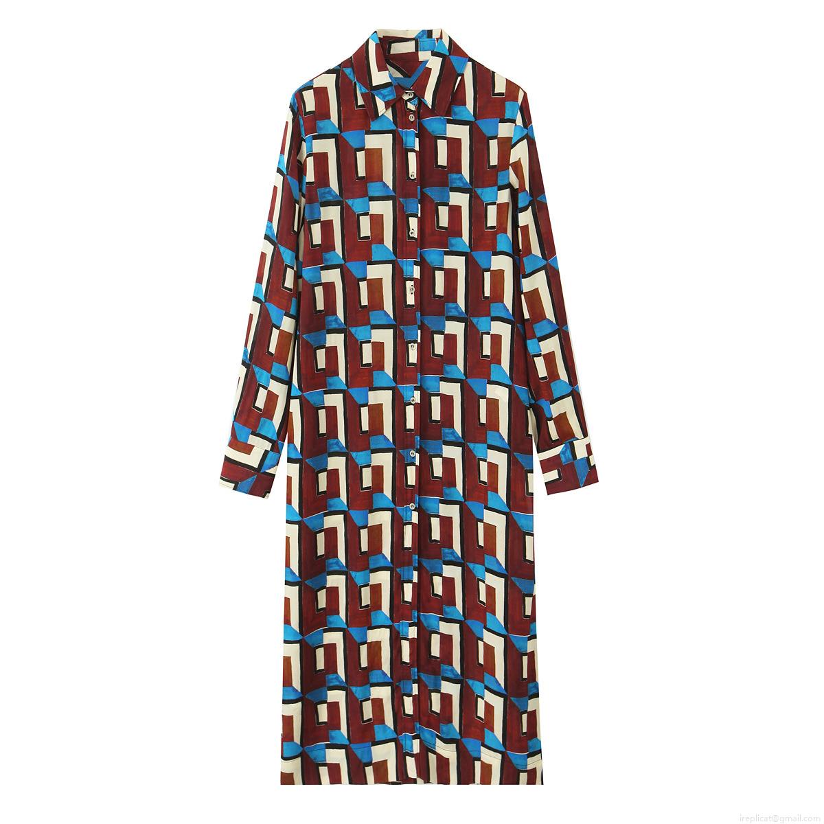 • Women's 2 Piece Outfits Retro Geometric Print Long Sleeve Button Down Shirt And High Waist Wide Leg Pants Set Vintage Color Block Tunic Trousers Set For Streetwear