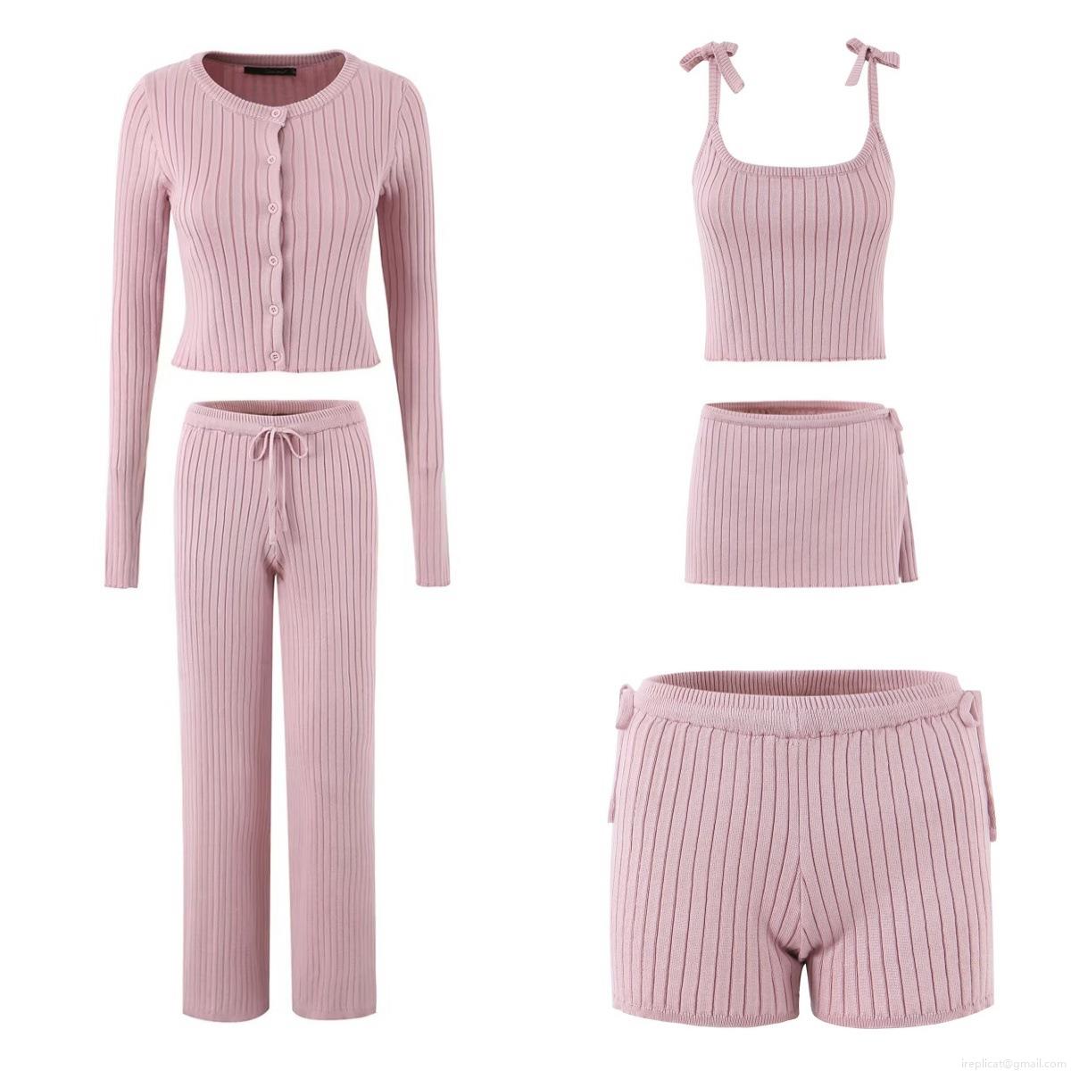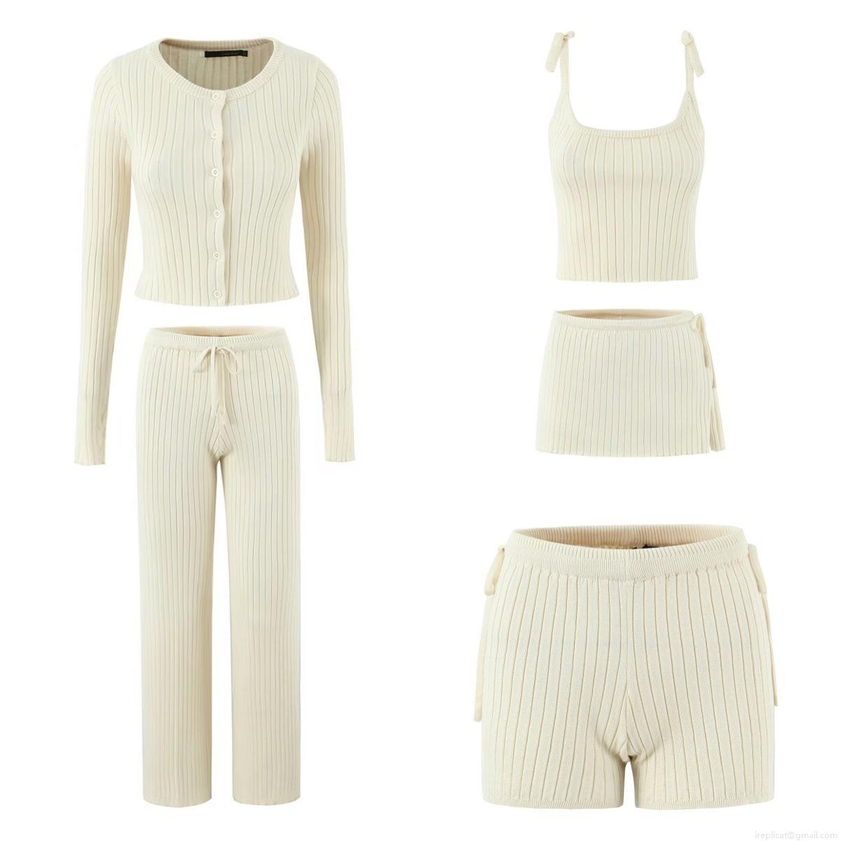 • Women's 5-Piece Knit Lounge Set 60% Viscose Ribbed Cardigan Camisole Shorts Skirt And Trousers Autumn Solid Color Soft Streetwear Outfit