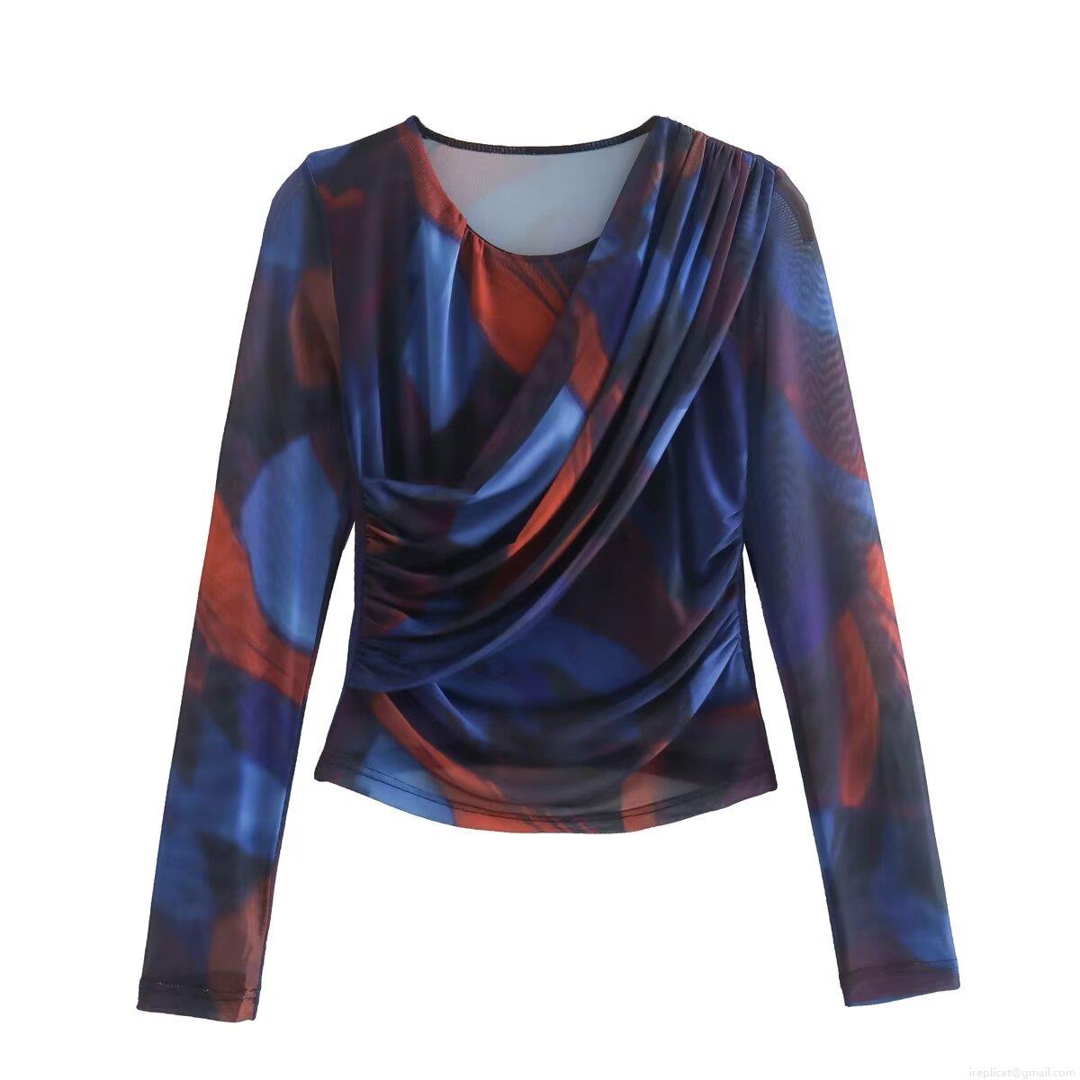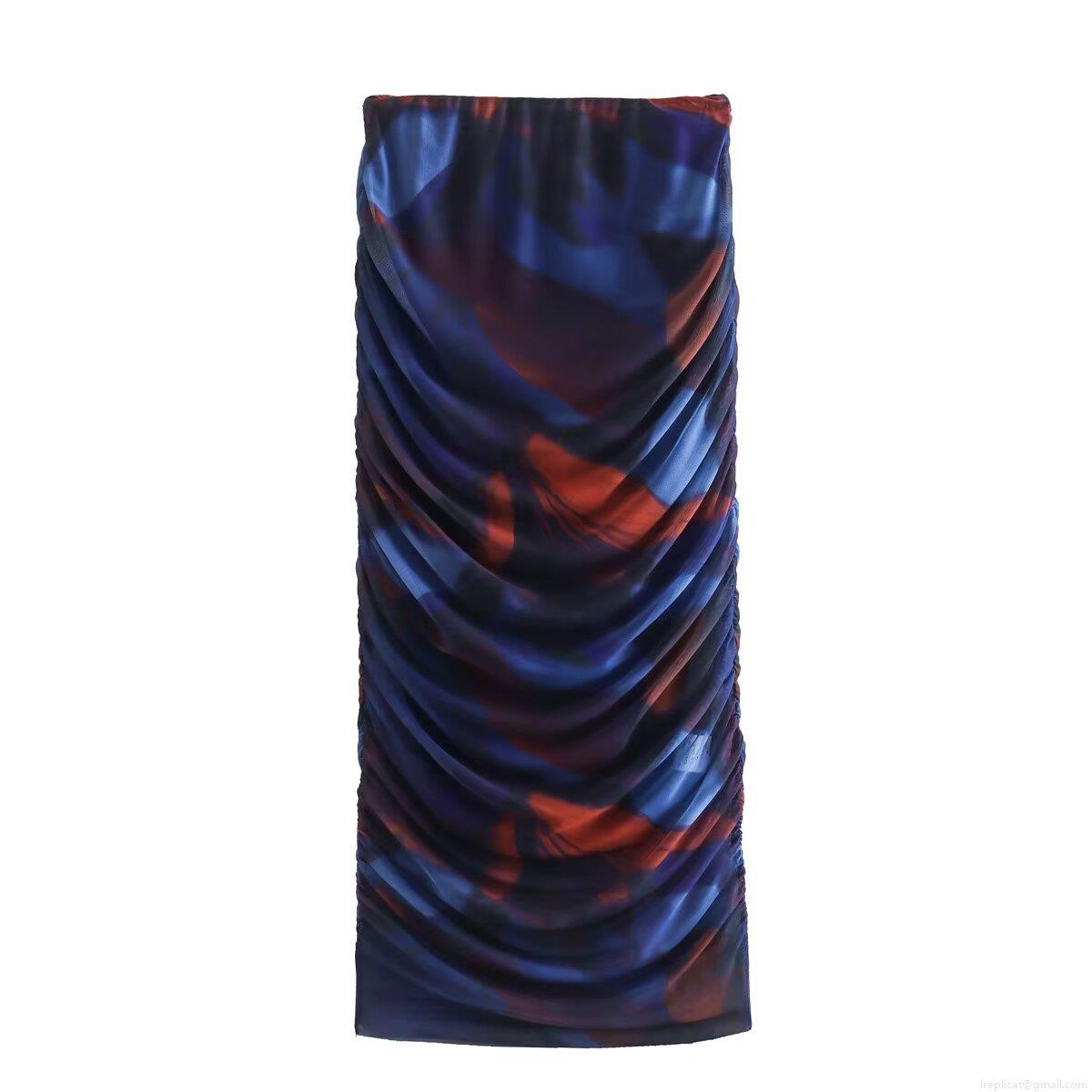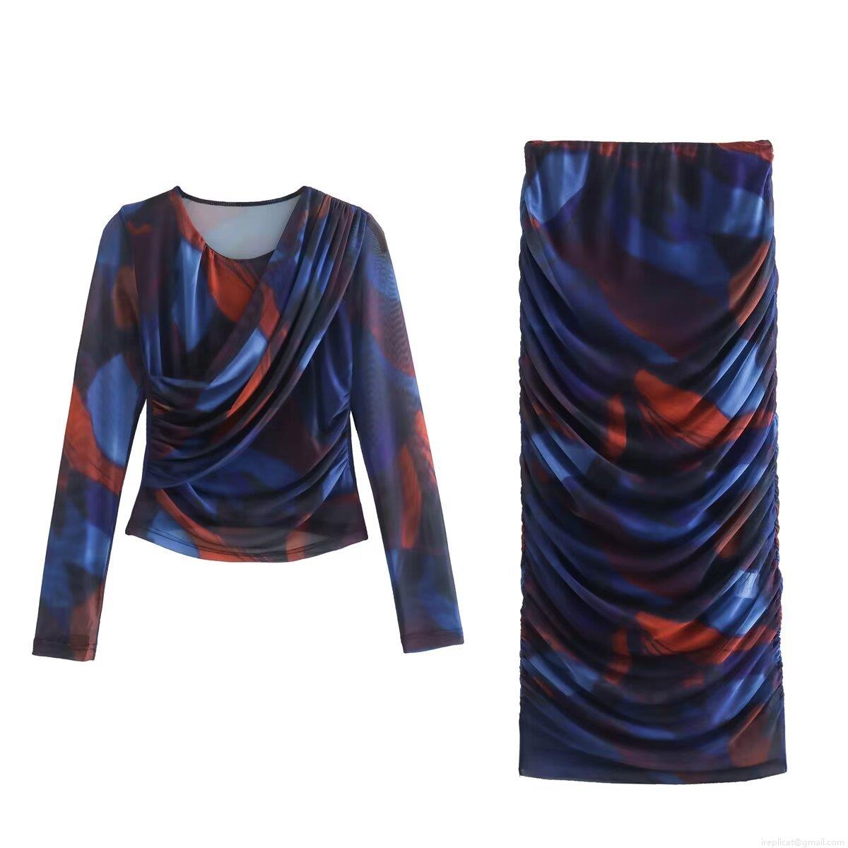 • Women's Abstract Print Mesh Two Piece Skirt Set Long Sleeve Ruched Top And Pleated Bodycon Midi Skirt Slim Fit Clubwear Outfit
