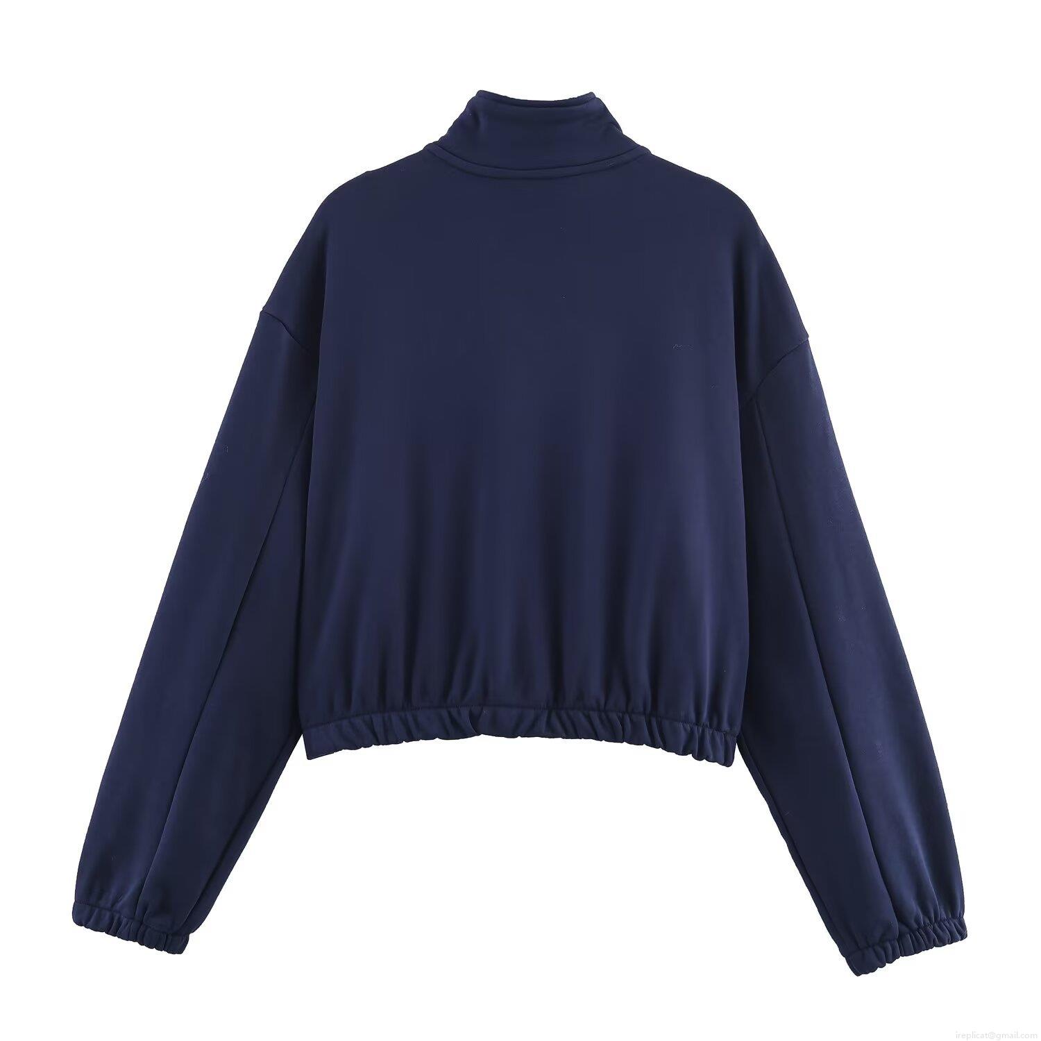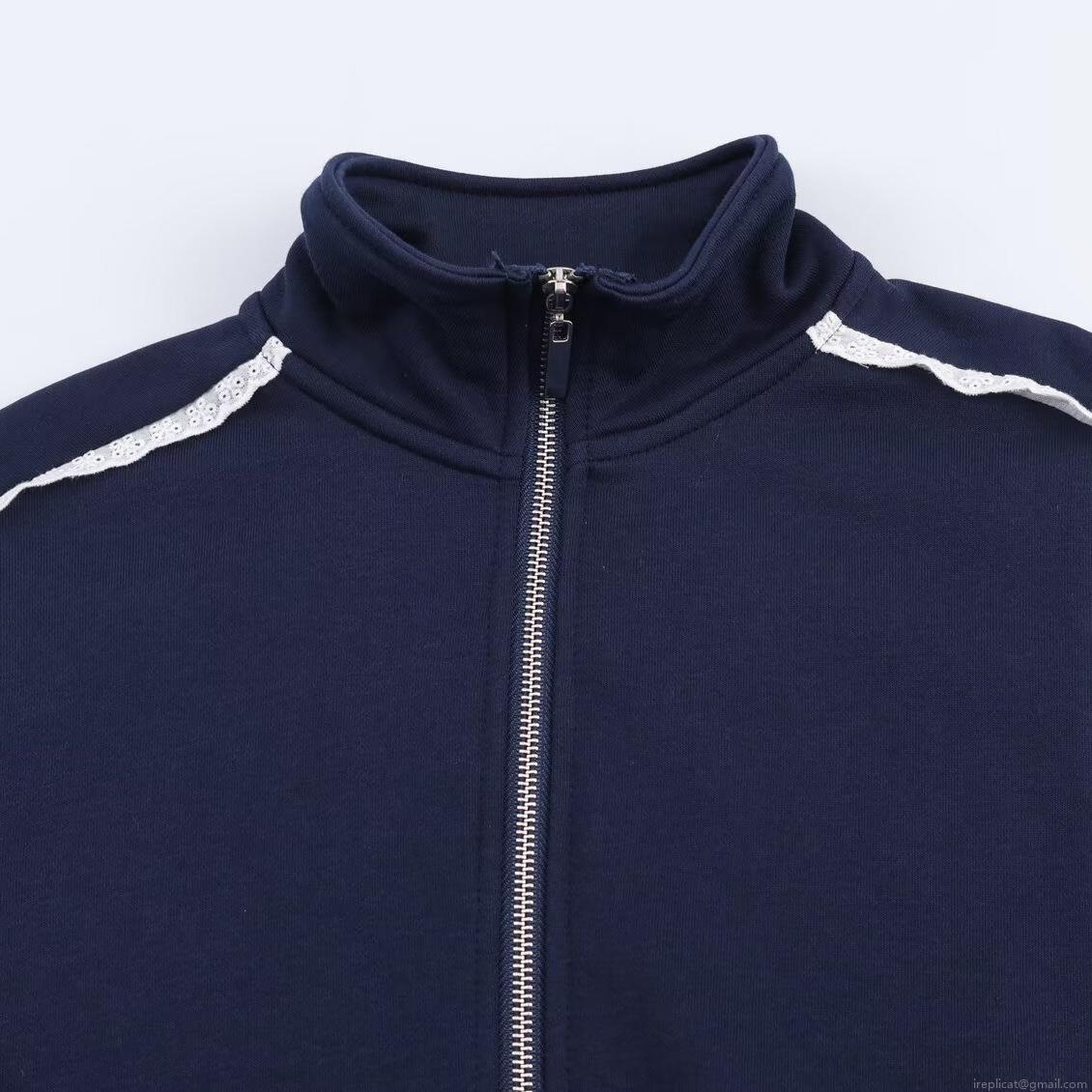 • Women's Navy Blue Casual Set Loose Stand Collar Zipper Sweatshirt and Wide Leg Pants Two-Piece Outfit with White Lace Trim Sporty Loungewear Tracksuit for Autumn