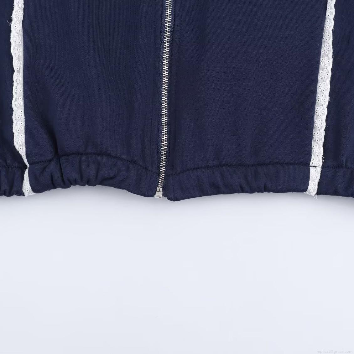 Women's Navy Blue Casual Set Loose Stand Collar Zipper Sweatshirt and Wide Leg Pants Two-Piece Outfit with White Lace Trim Sporty Loungewear Tracksuit for Autumn
