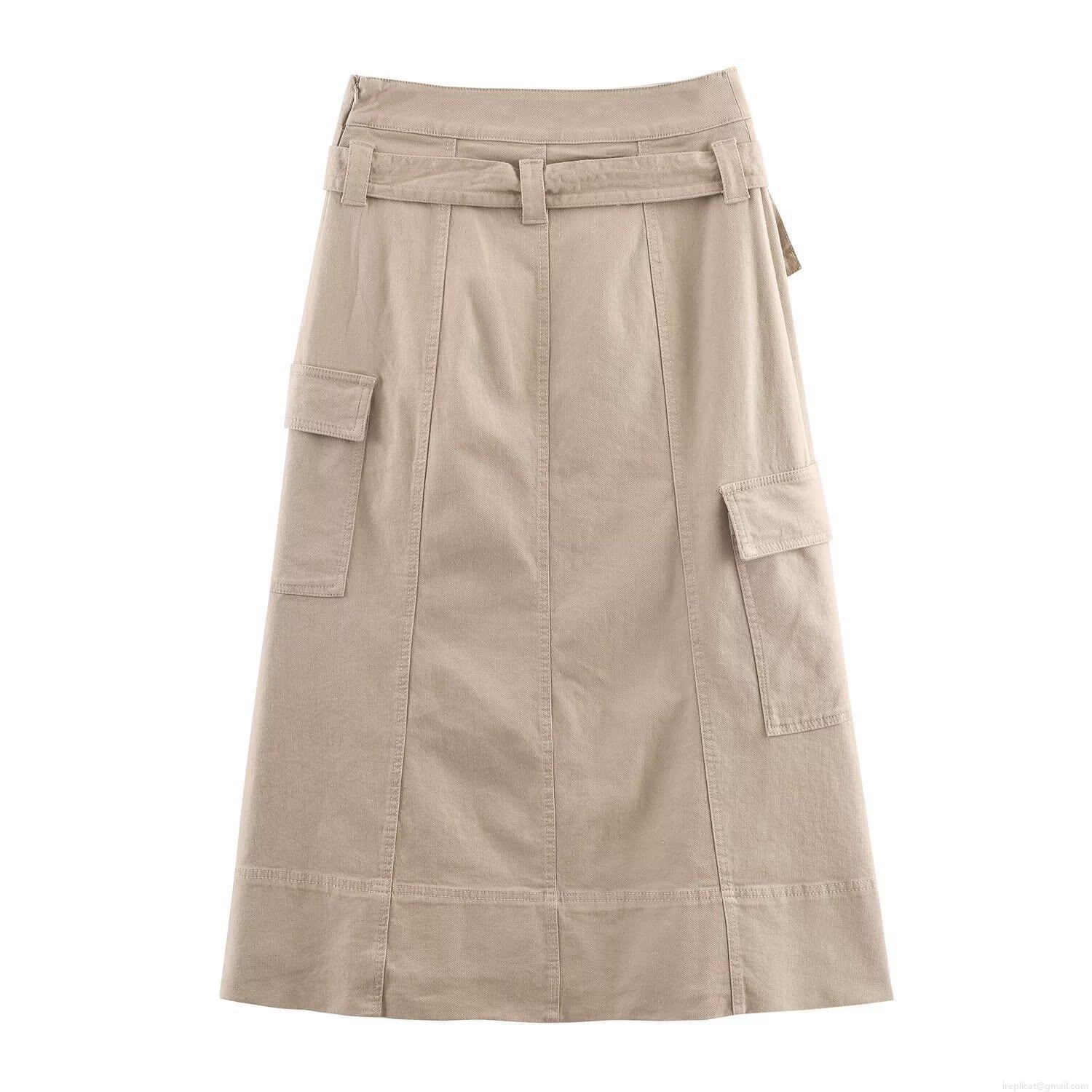 • Women's Autumn Cargo Midi Skirt With Belt High Waist Solid Color Multi-Pockets Polyester Casual Streetwear A-Line Skirt