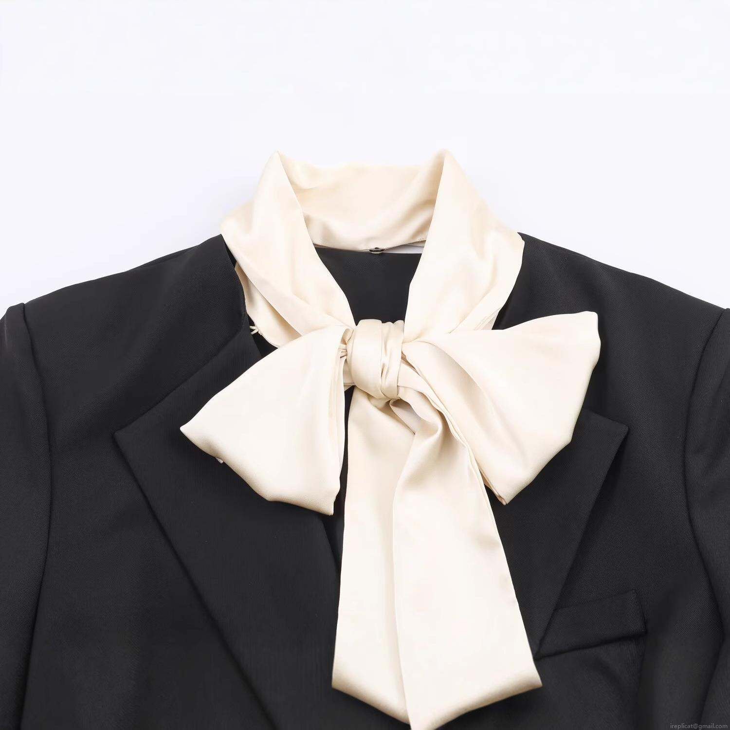 Elegant Women Black Blazer Suit Jacket With Large Creamy White Satin Bow Double Breasted Long Sleeve Office Party Outwear Fashion Hepburn Style Contrast Color Coat