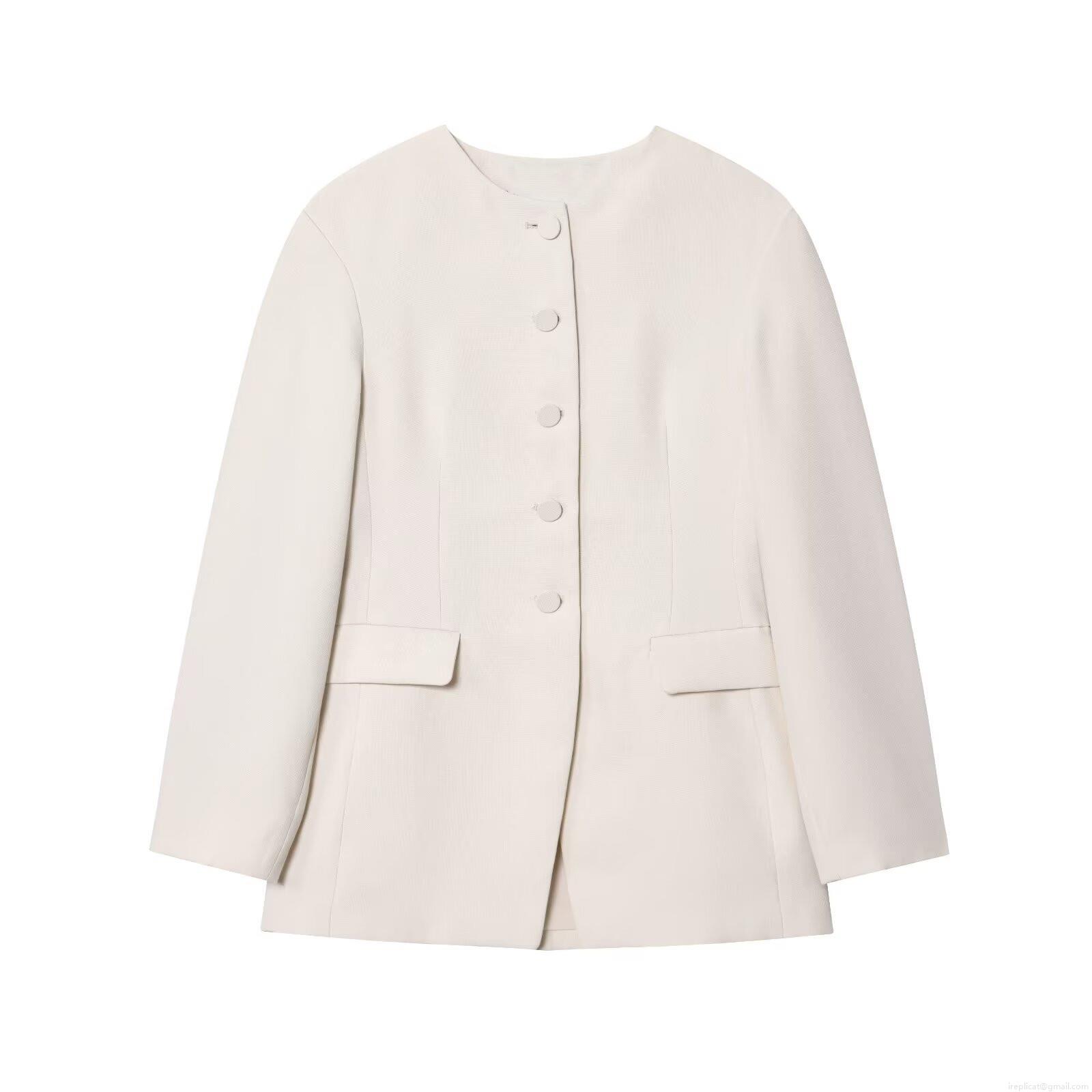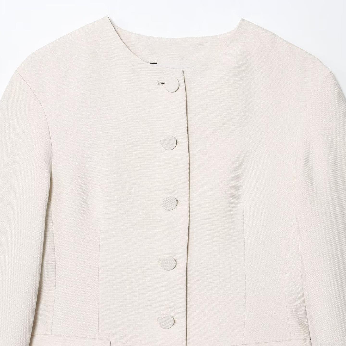 Elegant Women's Collarless Blazer Jacket Single Breasted Covered Buttons Solid Cream White Commute Office Wear Polyester Spandex Blend Autumn Outerwear With Flap Pockets