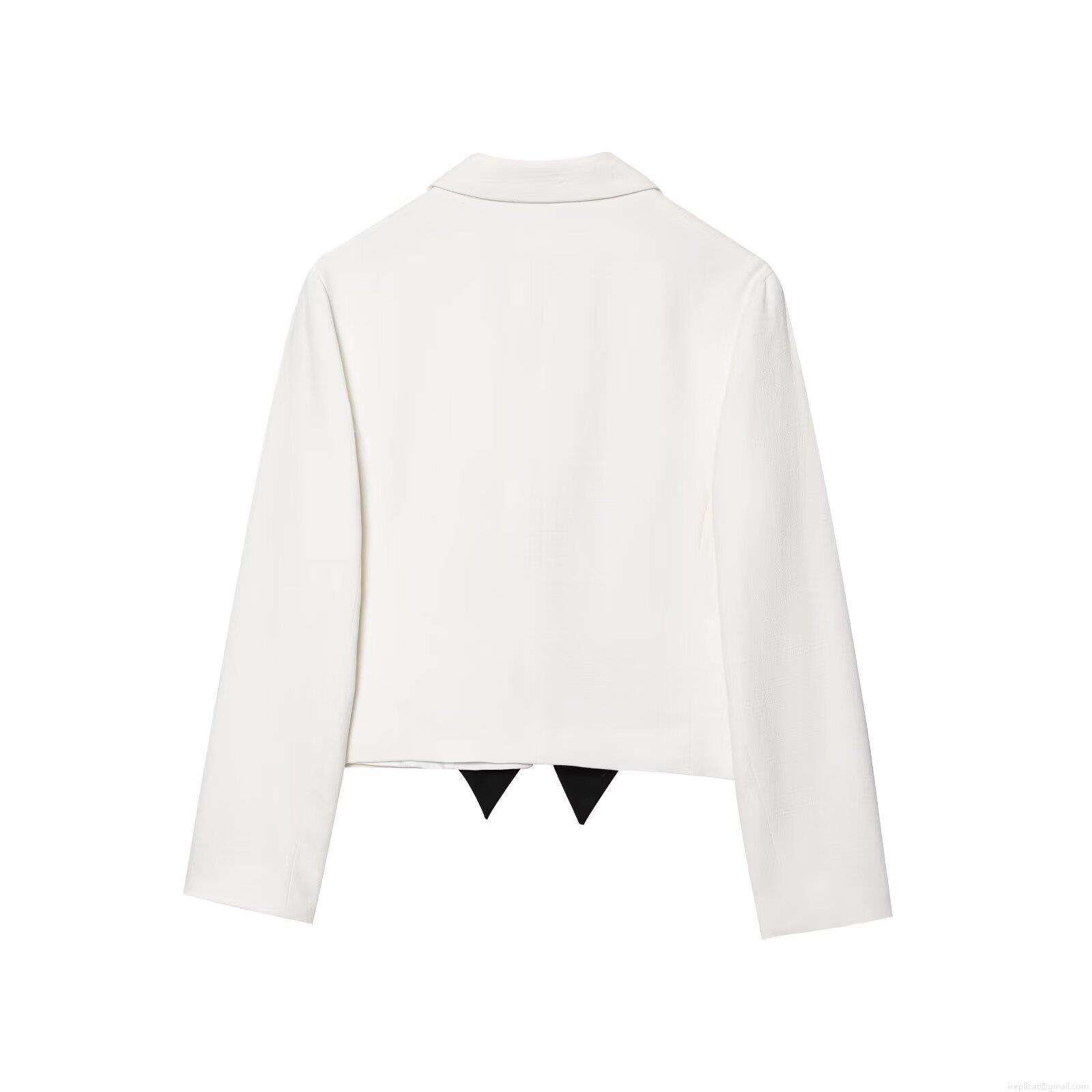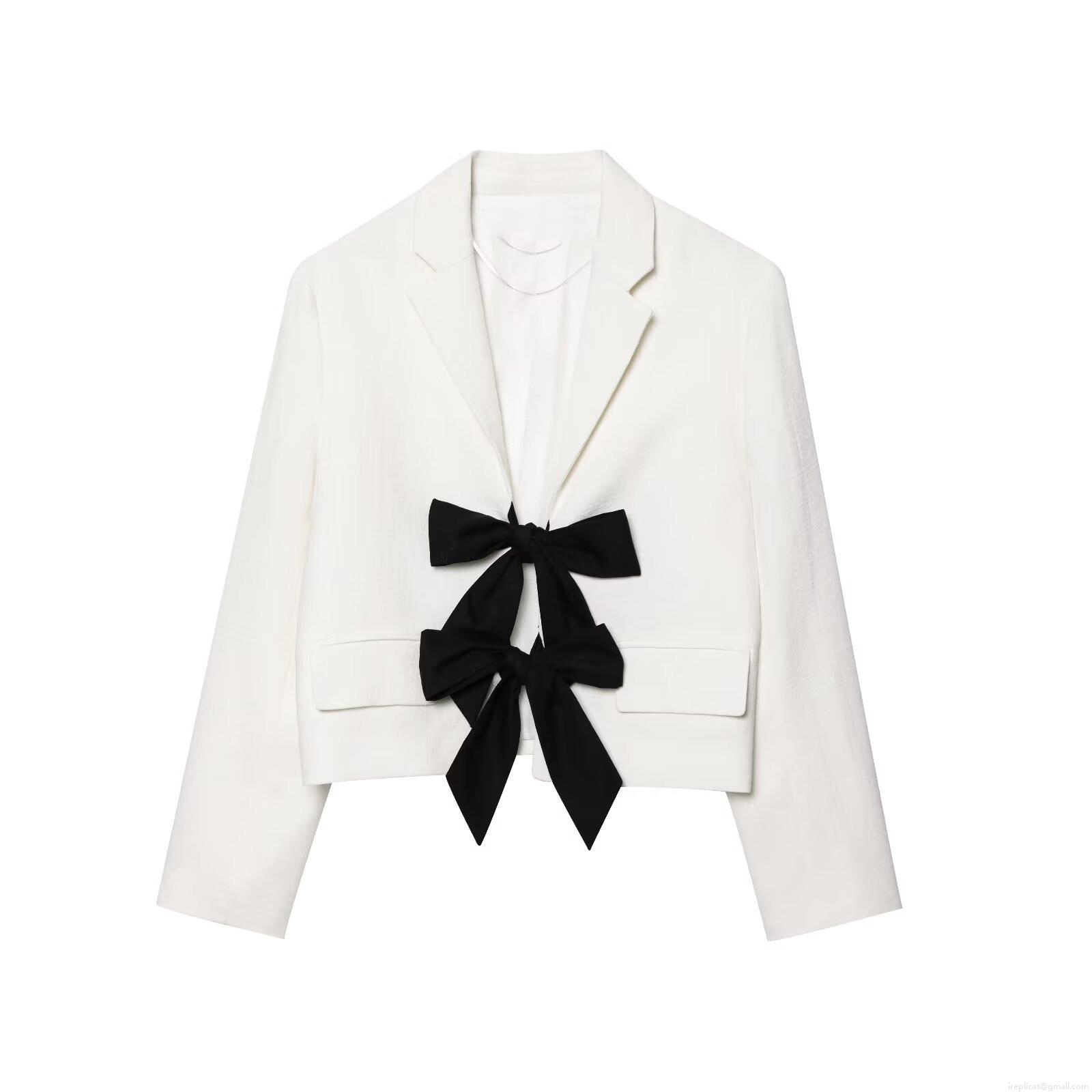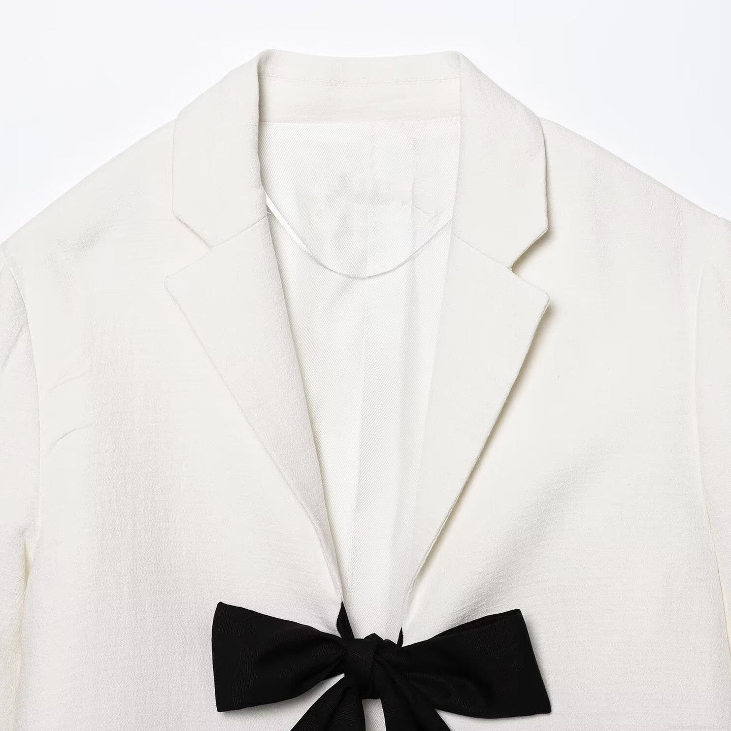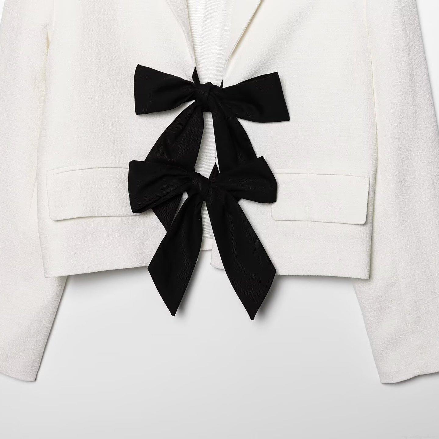 Elegant Women's Cropped Blazer Jacket With Large Contrast Bow Knot Long Sleeve Loose Fit Casual Office Outerwear White Black Patchwork Top
