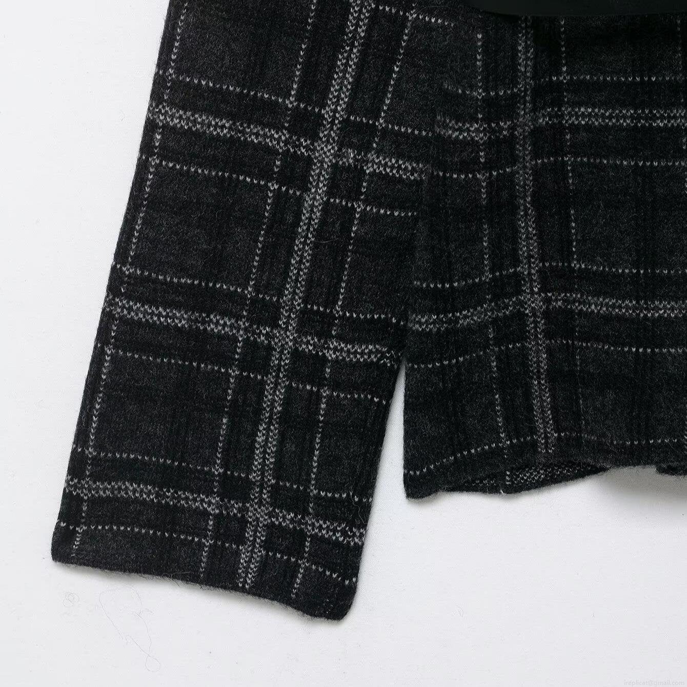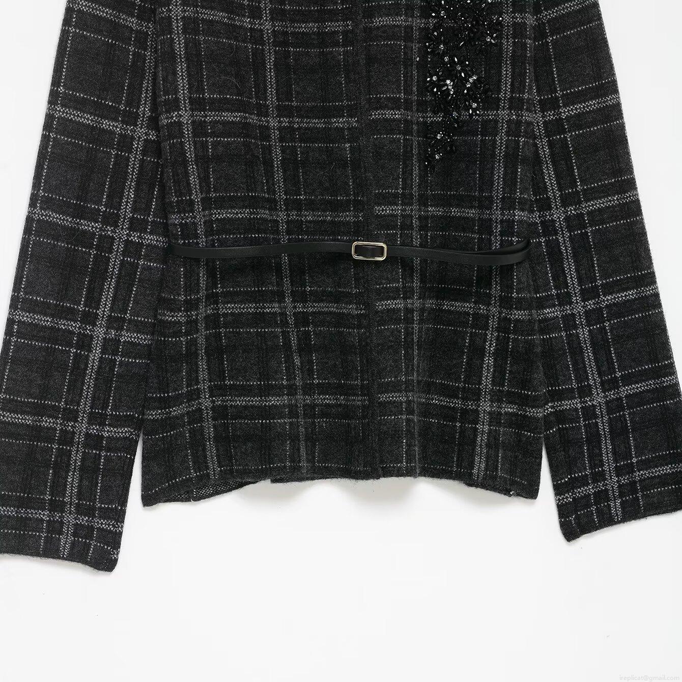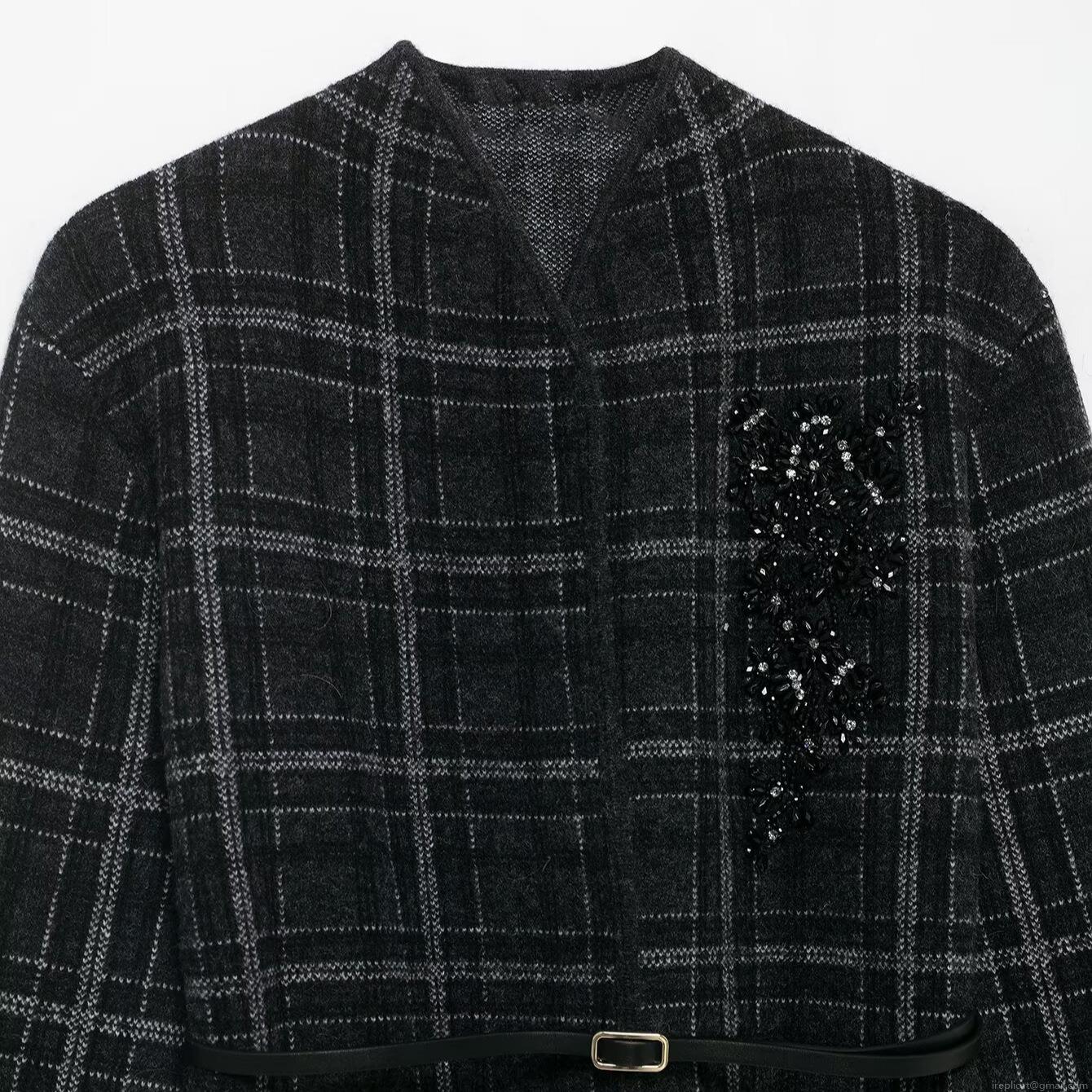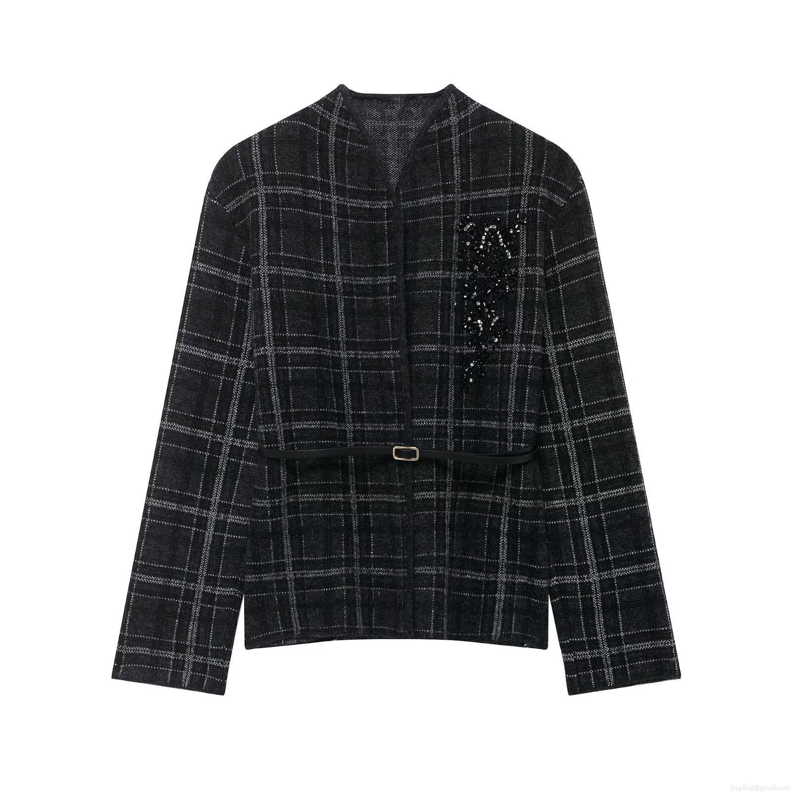 • Elegant Women's Plaid Knitted Blazer Jacket With Belt Sequin Floral Embroidery V-Neck Long Sleeve Commuter Outerwear Cardigan No Button