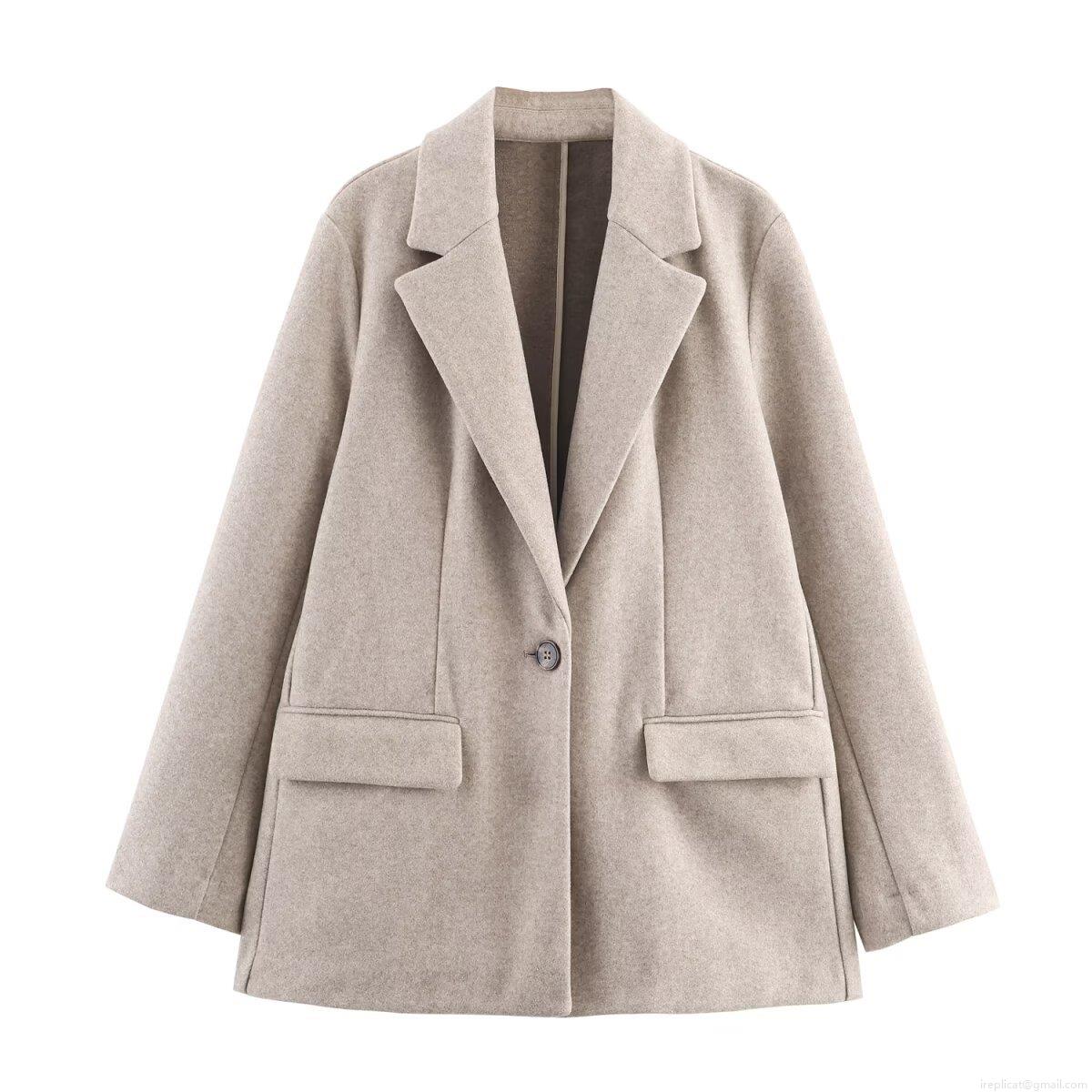 • Women Autumn Winter European Style Lapel Long Sleeve Woolen Texture Blazer Jacket With Pockets Single Breasted Loose Mid-Length Solid Color Polyester Streetwear Outerwear