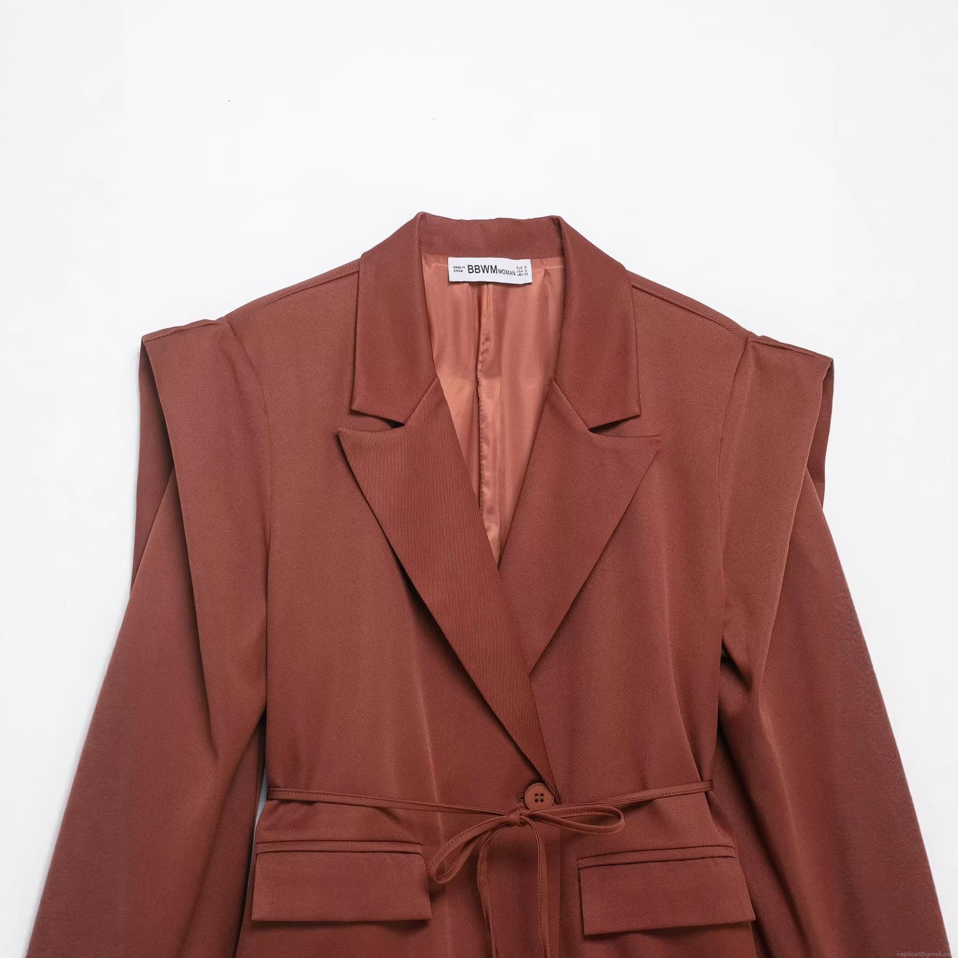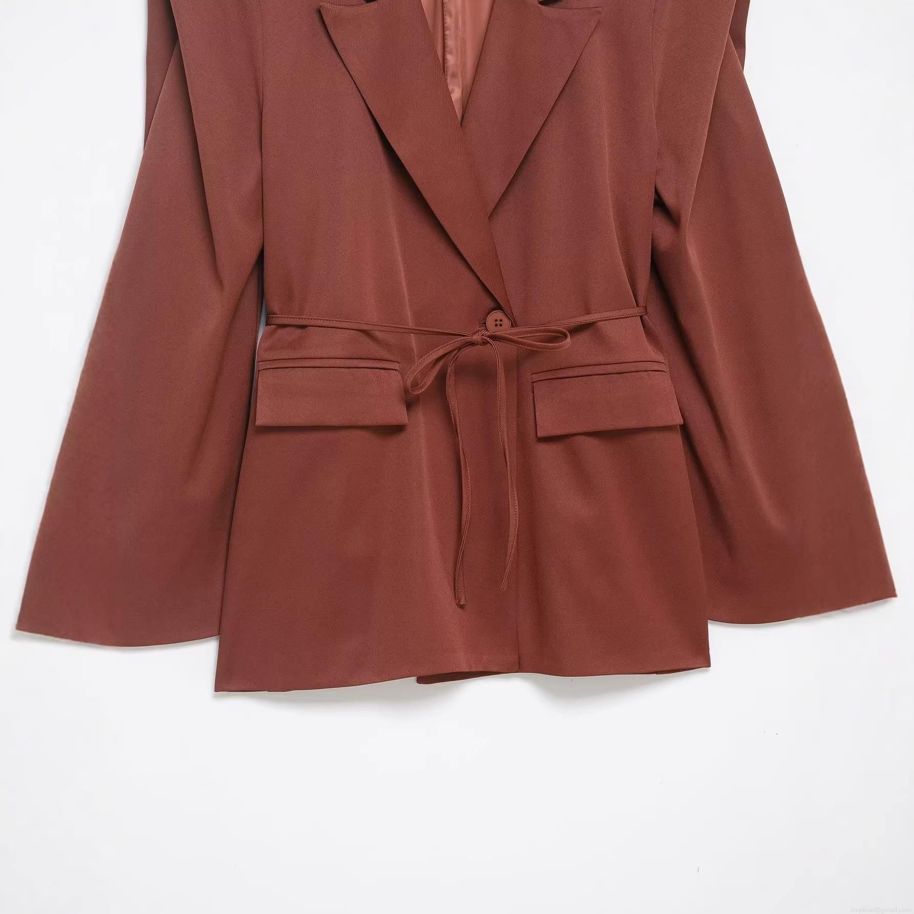 • Women Casual Waist Tie Blazer Jacket 100% Polyester Solid Color Padded Shoulder Long Sleeve Slim Fit Suit Coat For Office Lady Daily Wear Commuting