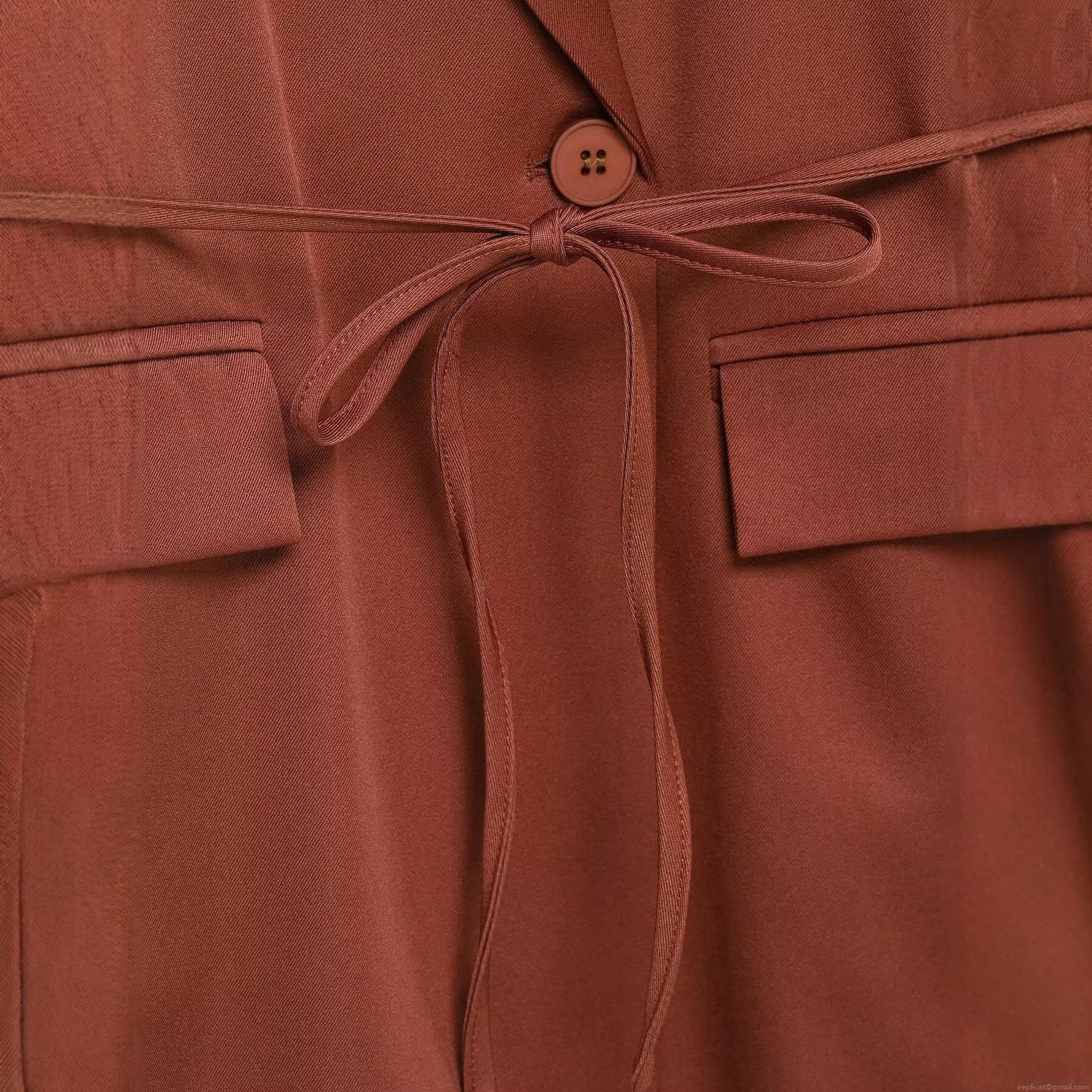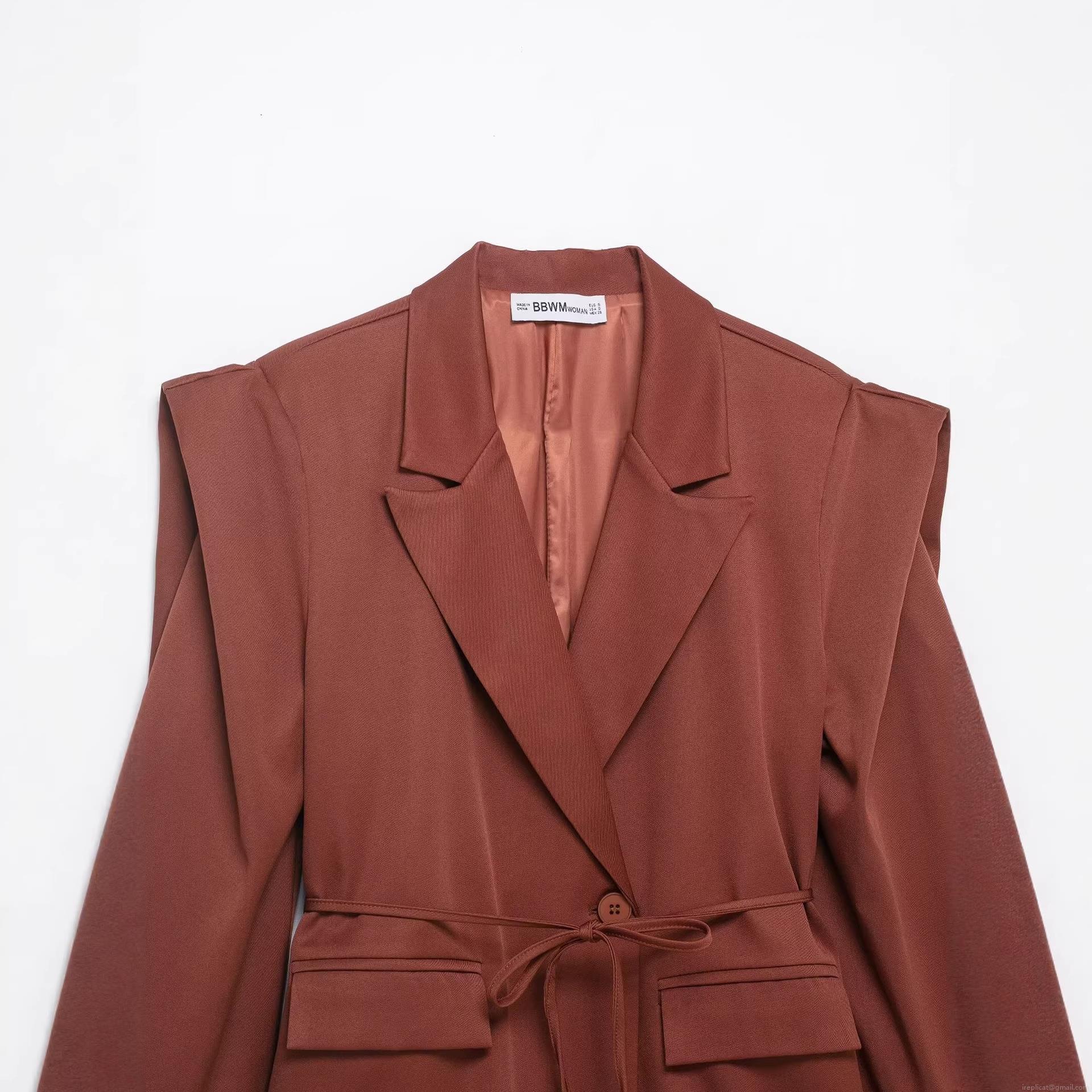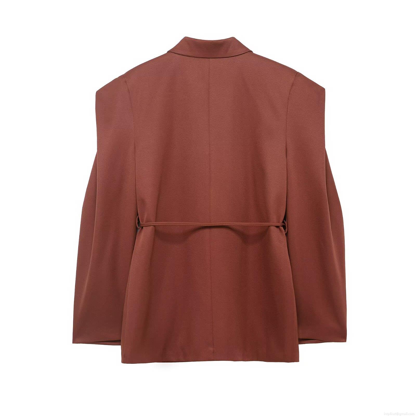 • Women Chic Single Breasted Tie Waist Blazer Jacket Long Sleeve Padded Shoulder Solid Color Rust Brown Polyester Suit Coat For Office Daily