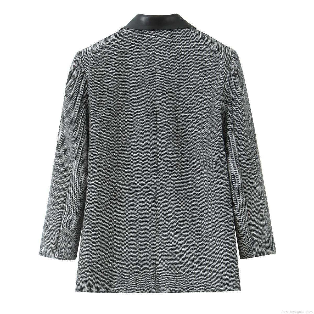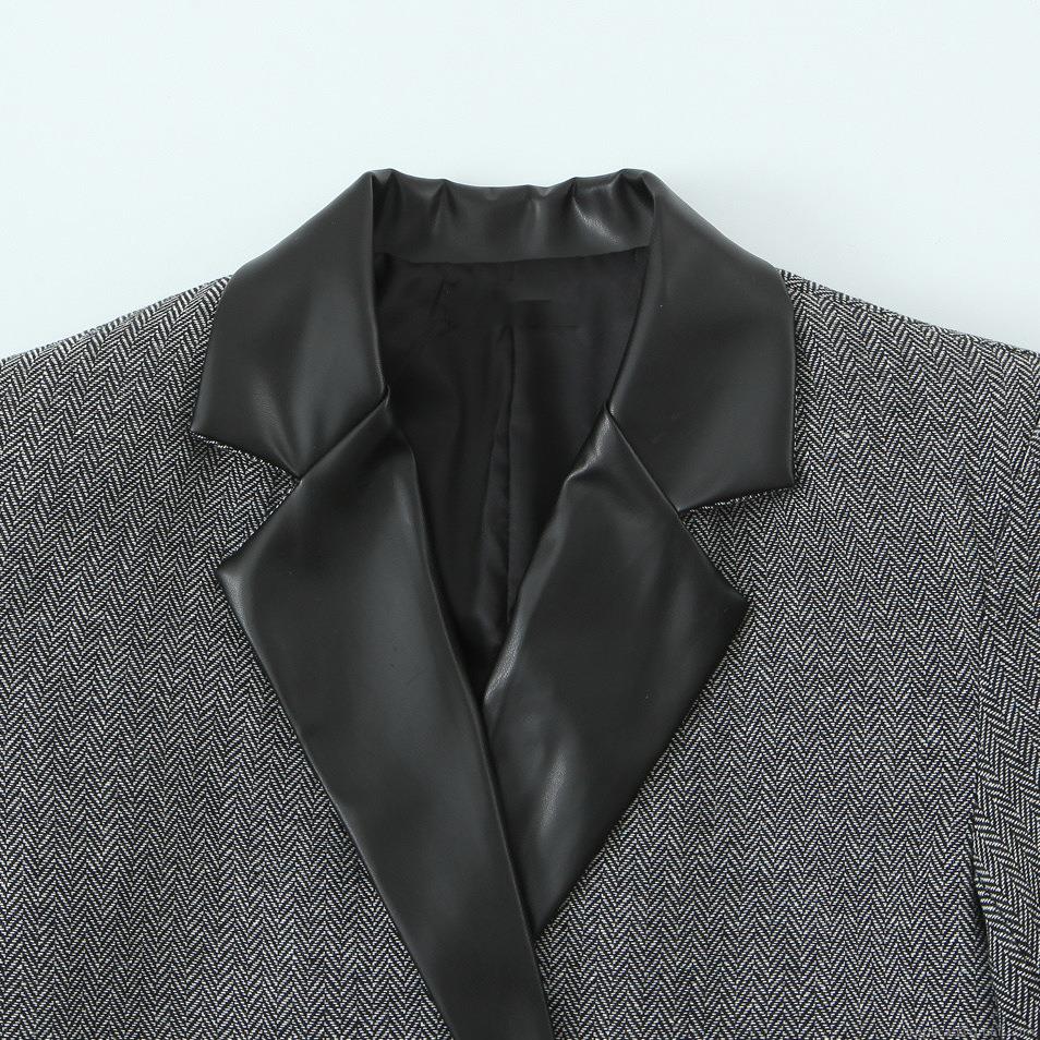 • Women Elegant Herringbone Blazer Jacket With PU Leather Patchwork Lapel Collar Double Breasted Long Sleeve Loose Fit Casual Outerwear For Office Lady