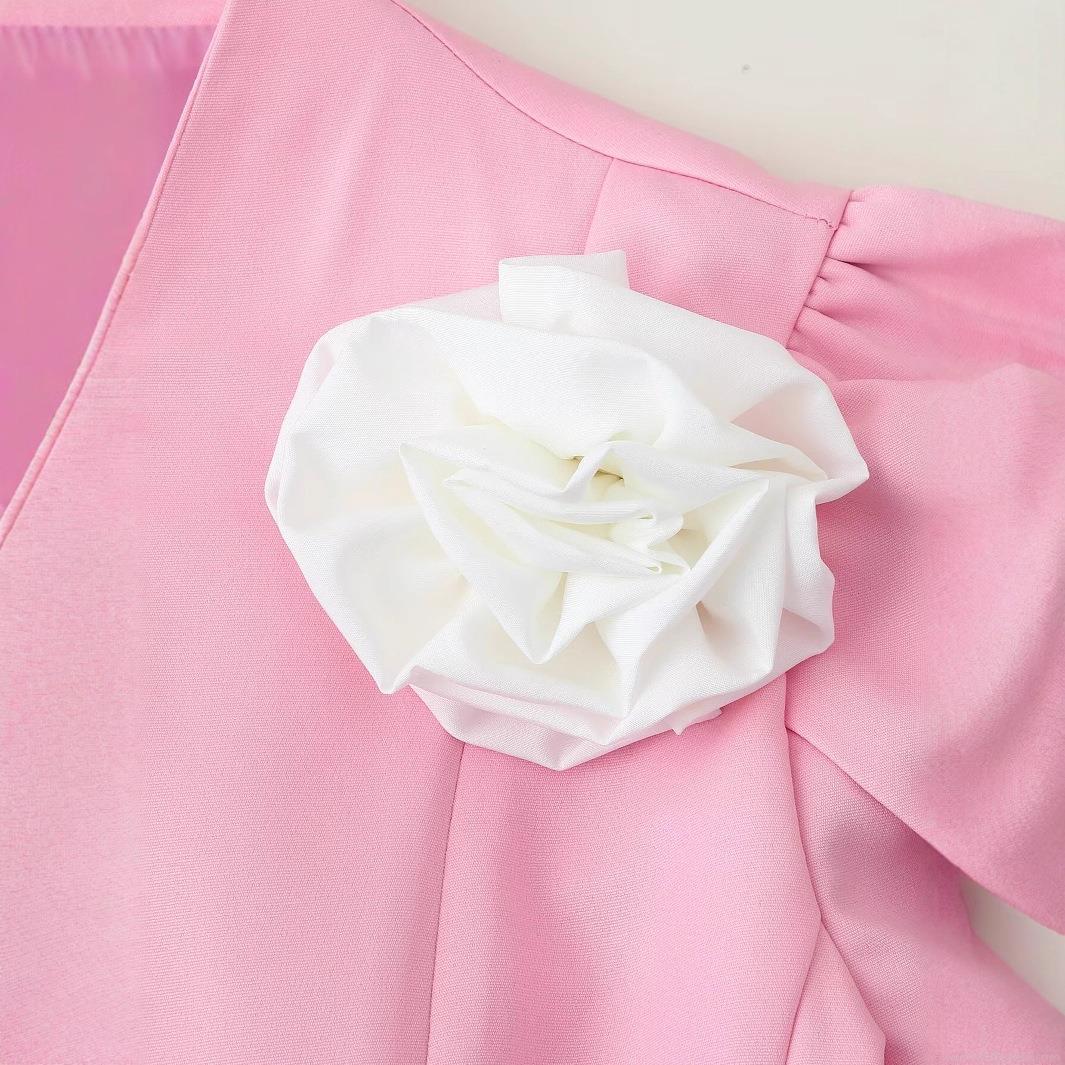 • Women Elegant Short Sleeve Blazer Top V-Neck Waist-Cinching Slim Fit Jacket With Handcrafted 3D Flower Single Breasted Puff Sleeve Blouse For Ladies Pink