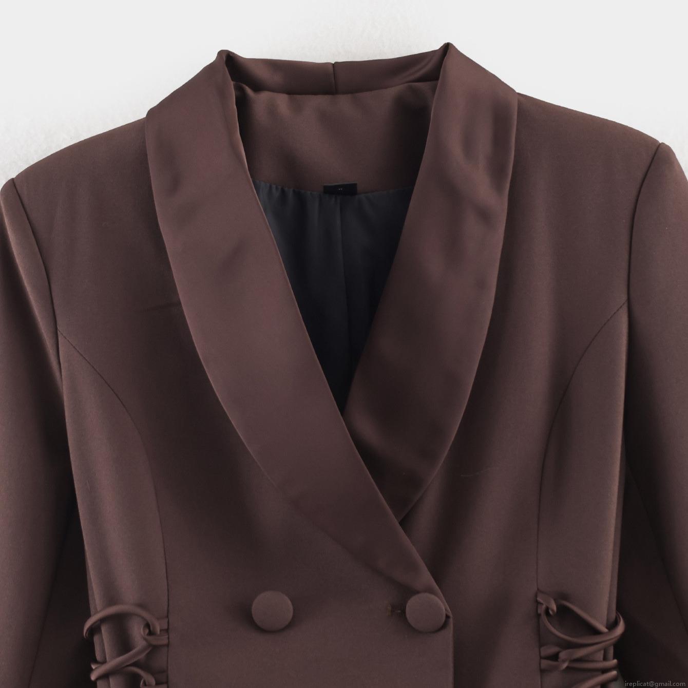 • Women Elegant Slim Fit Blazer Jacket Polyester Satin Patchwork Side Lace Up Double Breasted Shawl Collar Office Professional Commute Chic Outerwear Dark Brown