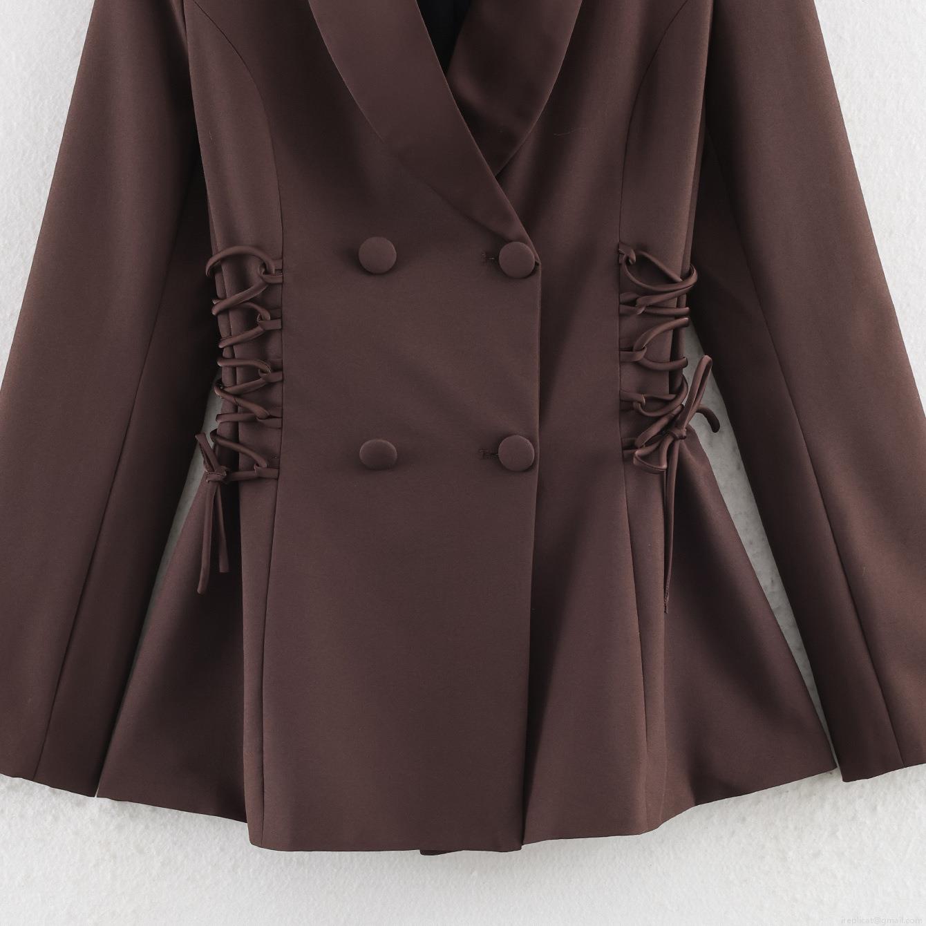 Women Elegant Slim Fit Blazer Jacket Polyester Satin Patchwork Side Lace Up Double Breasted Shawl Collar Office Professional Commute Chic Outerwear Dark Brown