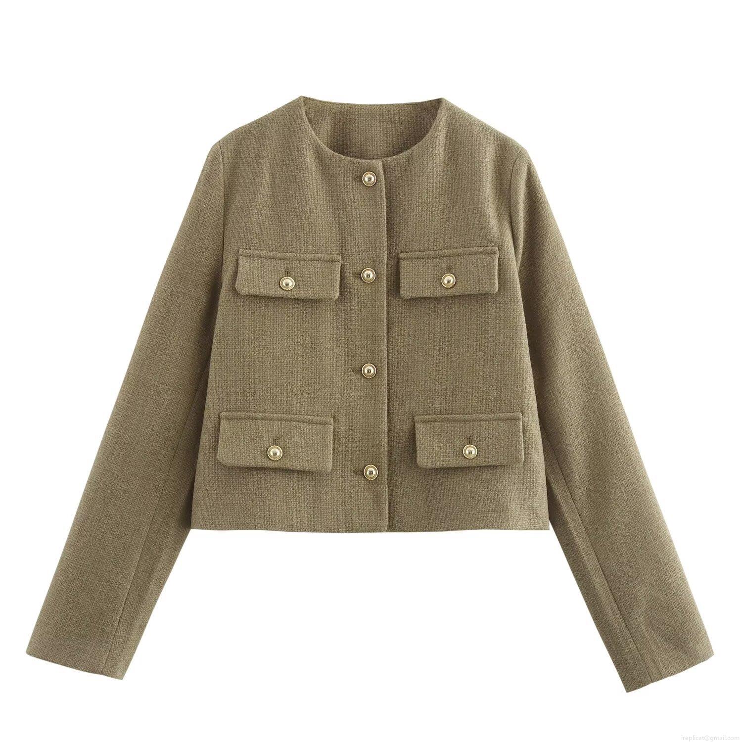 • Women Elegant Tweed Jacket Round Neck Gold Metal Button Crop Blazer Long Sleeve Autumn Winter Short Outwear Fashion Lady Slim Suit Jacket