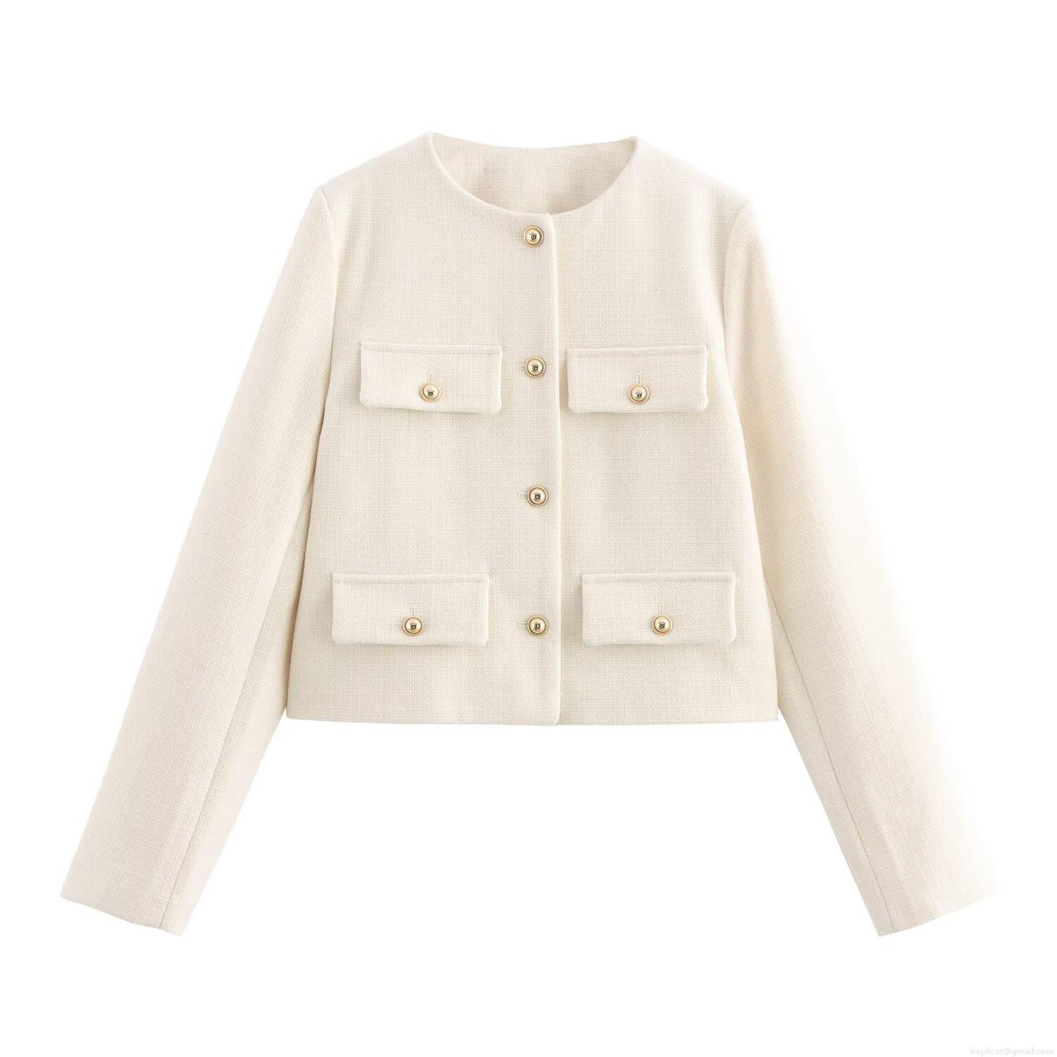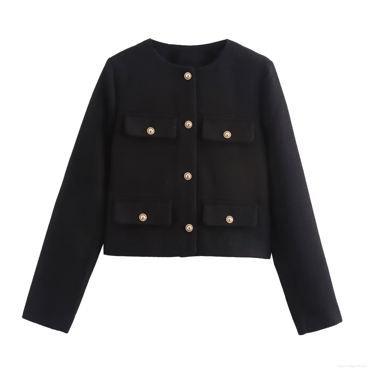 Women Elegant Tweed Jacket Round Neck Gold Metal Button Crop Blazer Long Sleeve Autumn Winter Short Outwear Fashion Lady Slim Suit Jacket