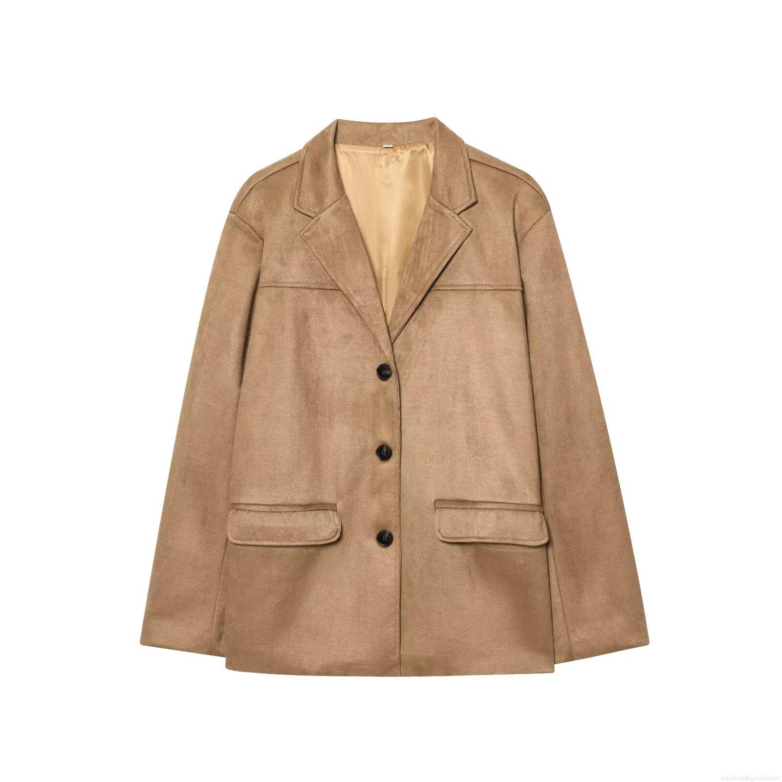 • Women Fashion Casual Faux Suede Blazer Jacket Notch Lapel Single Breasted Solid Color Outerwear For Office Daily Wear Spring Autumn Brown Camel