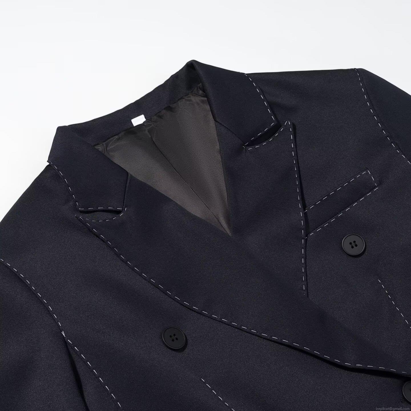 • Women Fashion Elegant Navy Blue Blazer Jacket With White Contrast Topstitching Single Breasted Long Sleeve Loose Commuter Suit Outerwear Office Wear