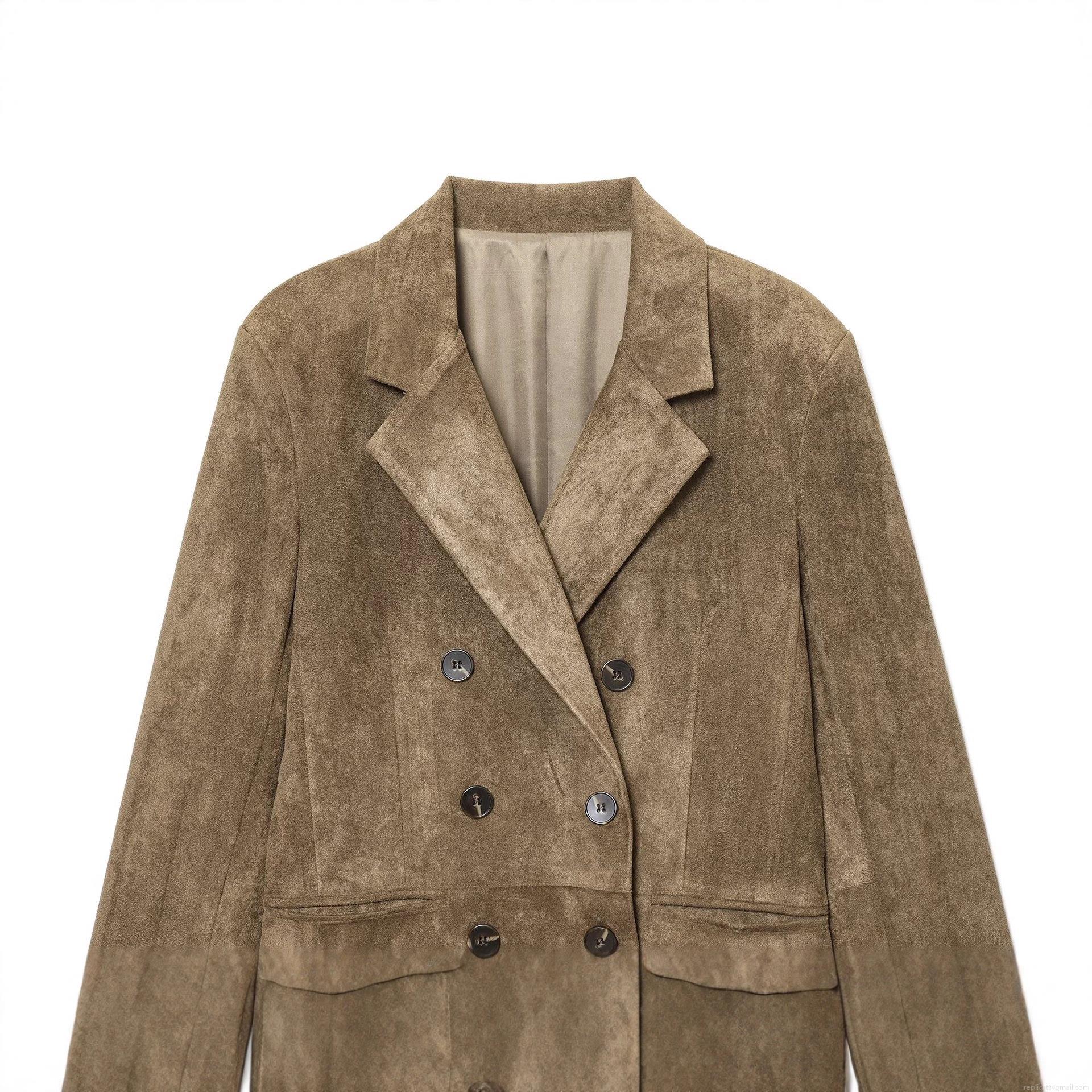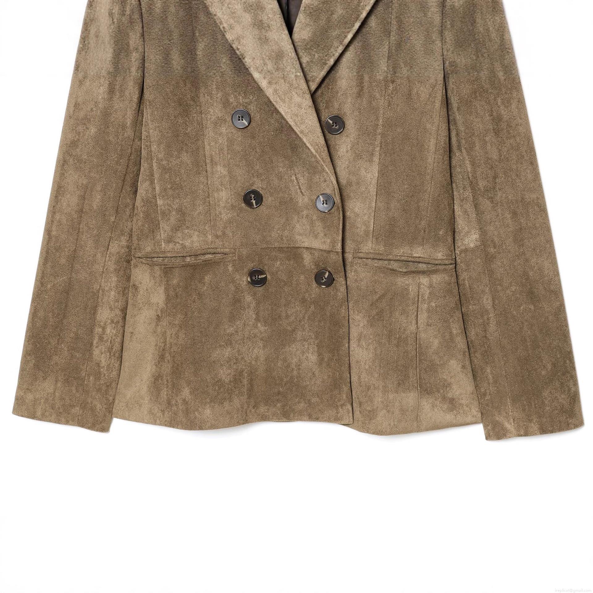 • Women Fashion Faux Suede Double Breasted Blazer Jacket Solid Brown Lapel Long Sleeve Office Work Suit Outerwear Casual Streetwear Coat