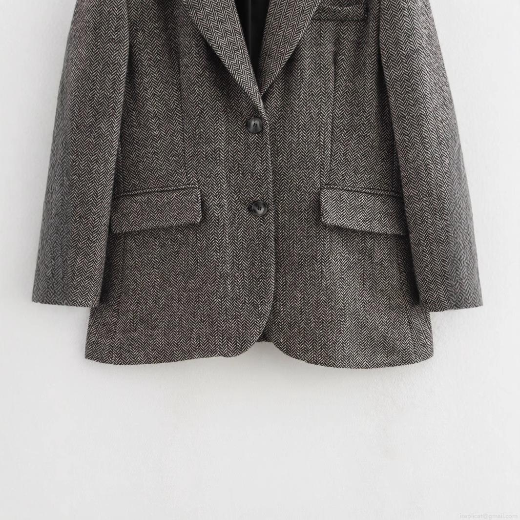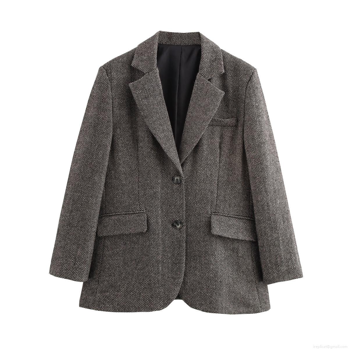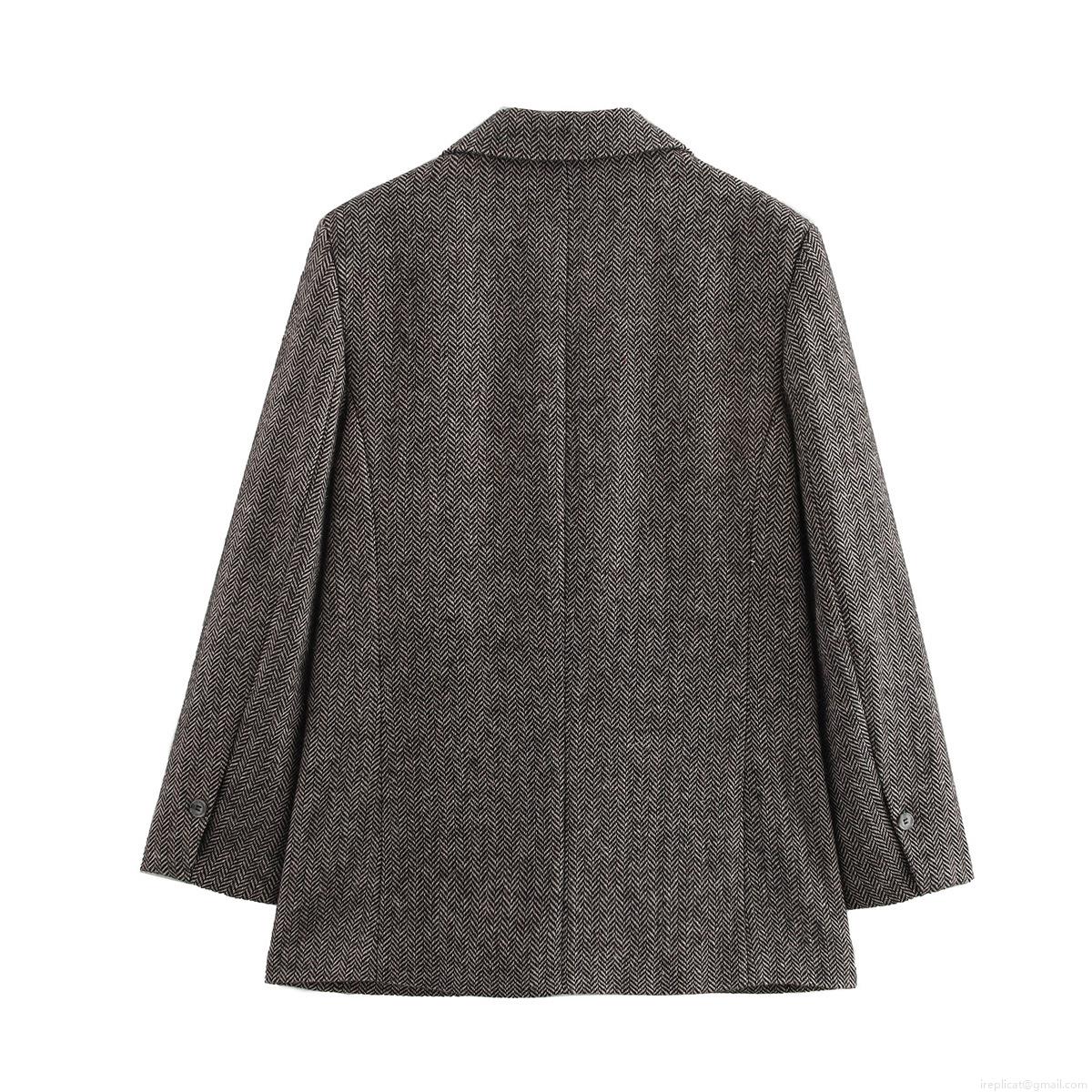 • Women Herringbone Blazer Jacket Long Sleeve Notch Lapel Loose Fit Regenerated Cellulose Fiber Faux Woolen Coat Office Lady Business Casual Outerwear Grey