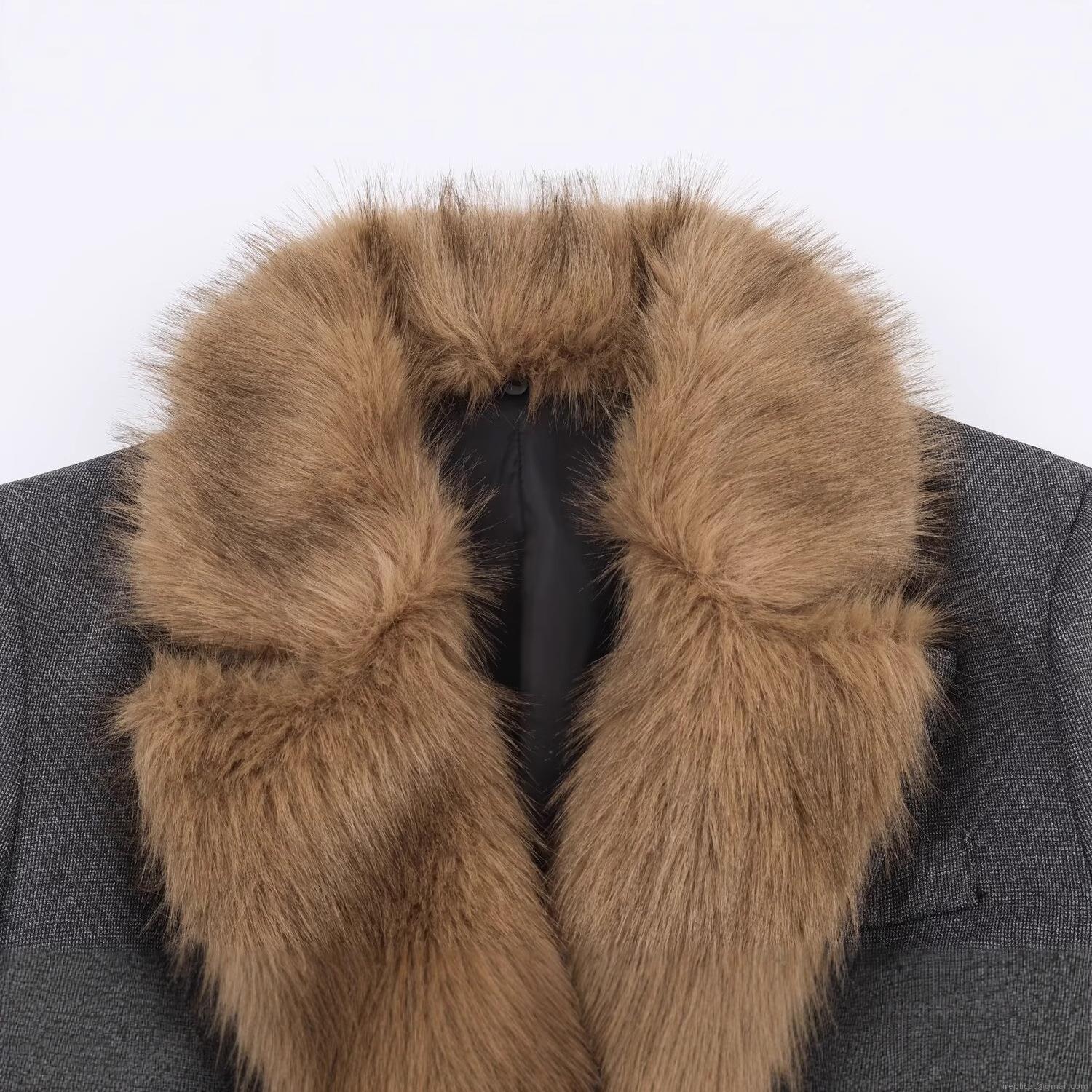 • Women Slim Fit Faux Fur Collar Lapel Blazer Jacket Elegant Grey Textured Long Sleeve Short Coat For Autumn Winter Office Party