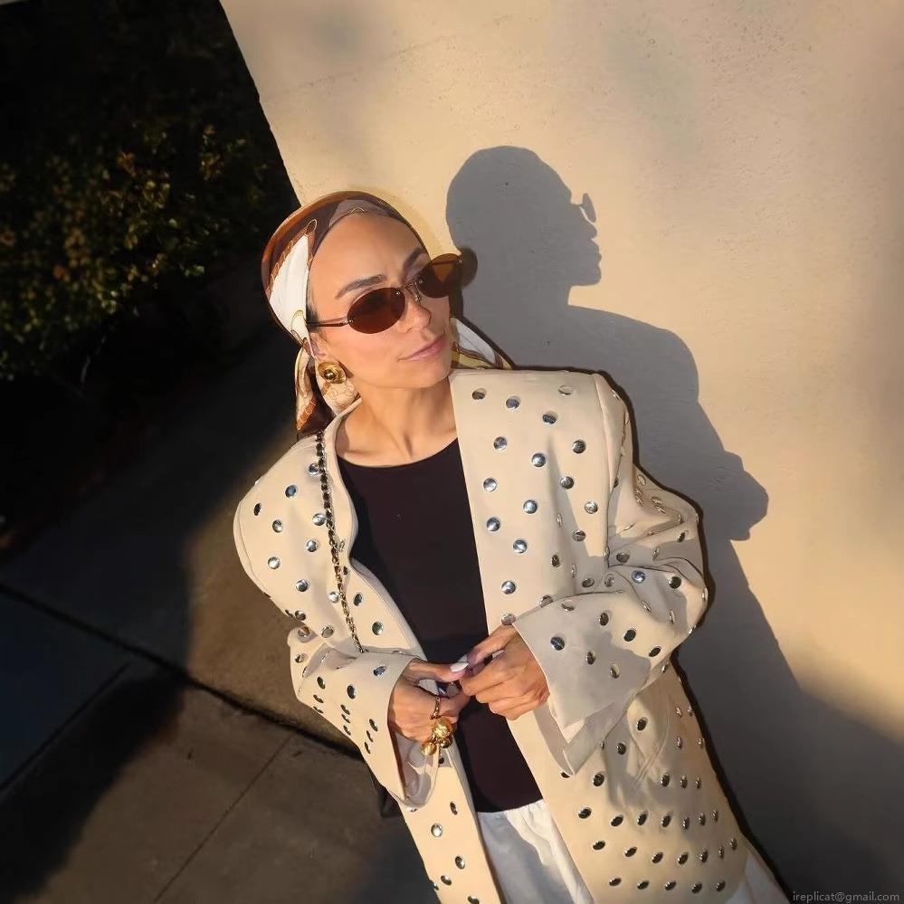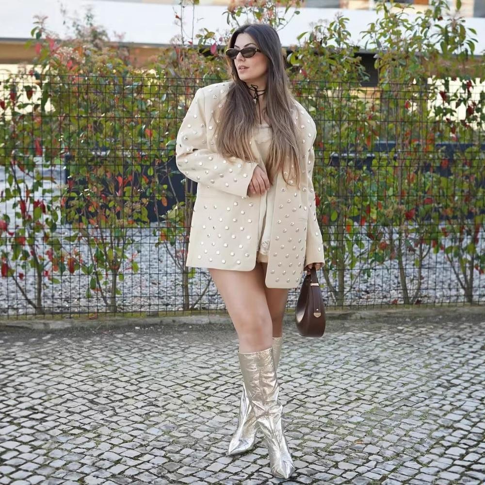 Women Studded Blazer Jacket Silver Metal Rivet Oversized Cream Beige Lapel Outerwear Fashion Casual Party Wear Socialite Style Long Sleeve Coat