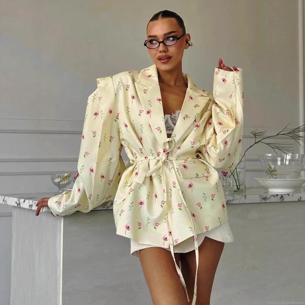 Women's Casual Blazer Jacket With Waist Tie Belt Notch Lapel Long Sleeve Loose Fit Fashion Polyester Outerwear For Ladies Office Daily Wear