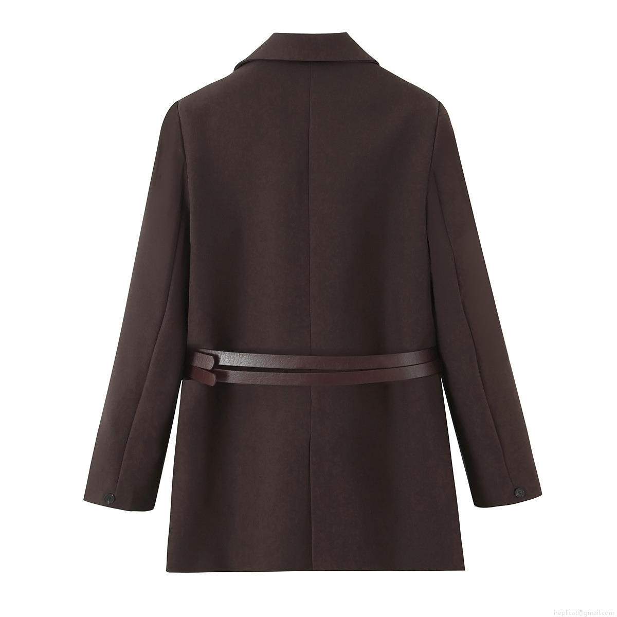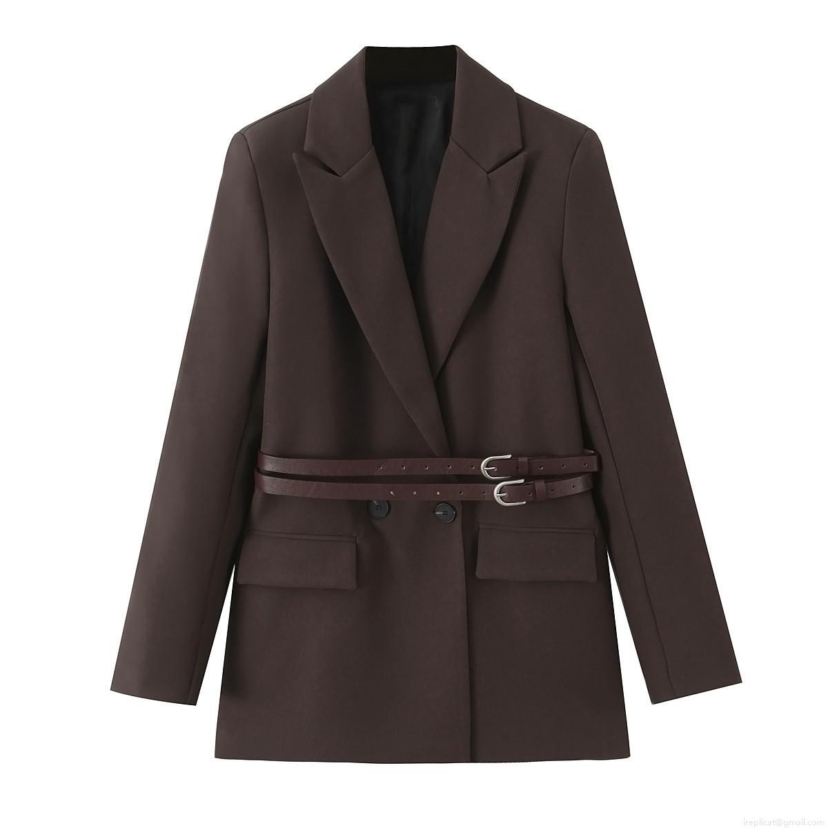 Women's Classic Deep Brown Blazer Jacket Elegant Mid-Length Suit With Double Waist Belts Lapel Double Breasted Office Lady Commuter Outerwear