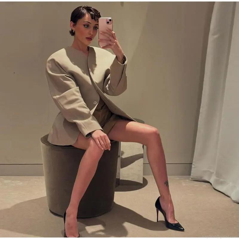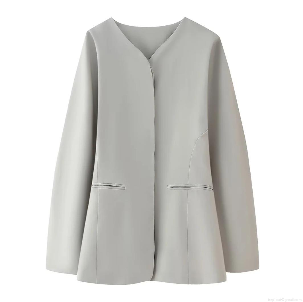 • Women's Collarless Solid Color Woven Polyester Blazer Jacket With Double Pockets Loose Fit Long Sleeve Fashion Office Outerwear Casual Versatile Top