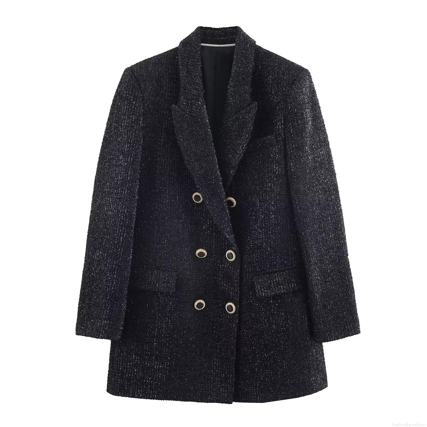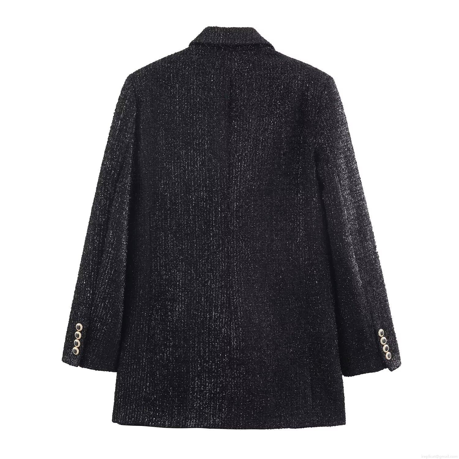 • Women's Double Breasted Metallic Thread Tweed Blazer Jacket Long Sleeve Shimmer Black Suit Coat With Gold Buttons Elegant Streetwear Outerwear