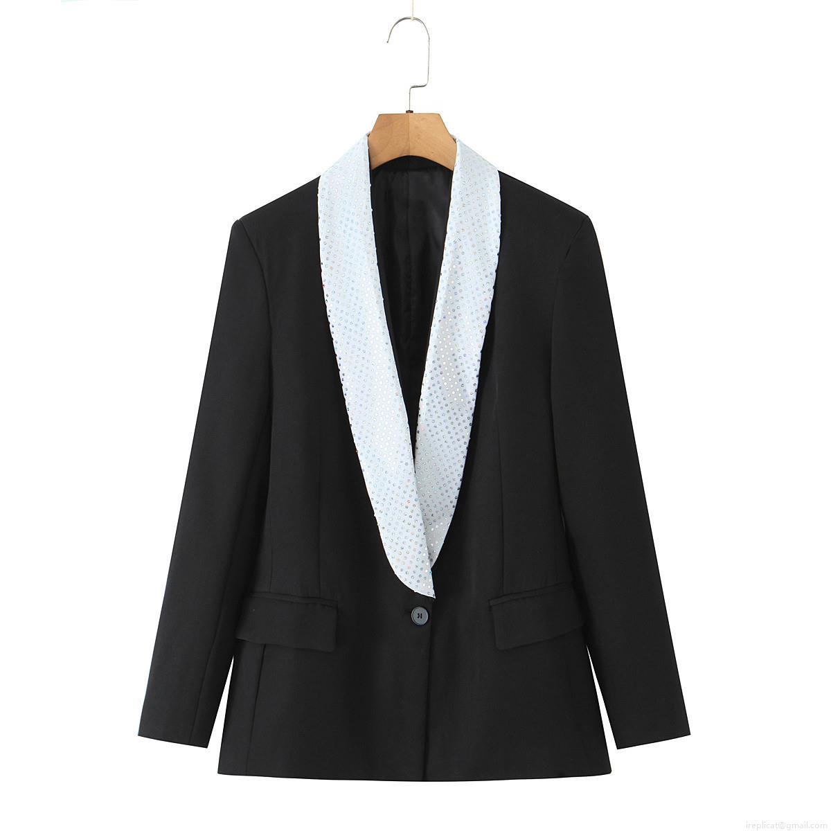• Women's Elegant Black Blazer With Contrast White Sequined Lapel Single Button Long Princess Sleeve Fashion Office Work Party Jacket For Women
