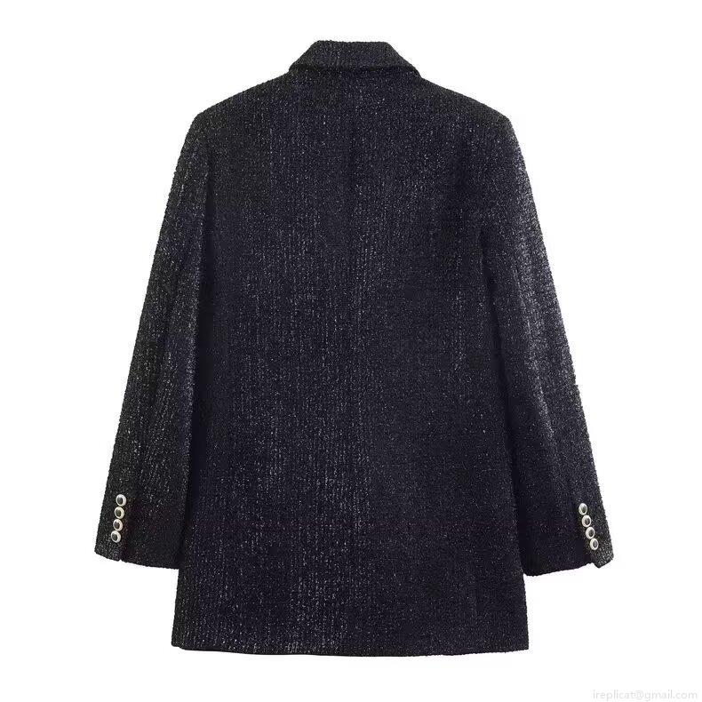 • Women's Elegant Black Tweed Blazer Double Breasted Long Sleeve Formal Jacket Office Lady Suit Outerwear With Shiny Metallic Thread And Metal Buttons