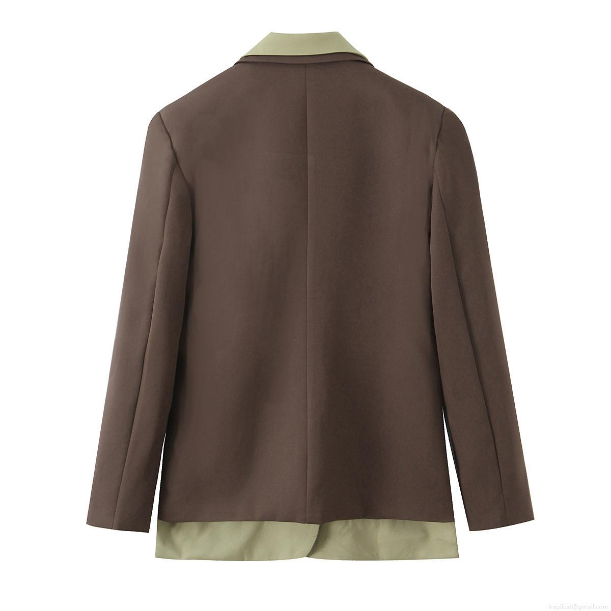 • Women's Elegant Contrast Color Patchwork Blazer Jacket Loose Fit Polyester Spandex Long Sleeve Suit Coat For Office Daily Wear Coffee Green