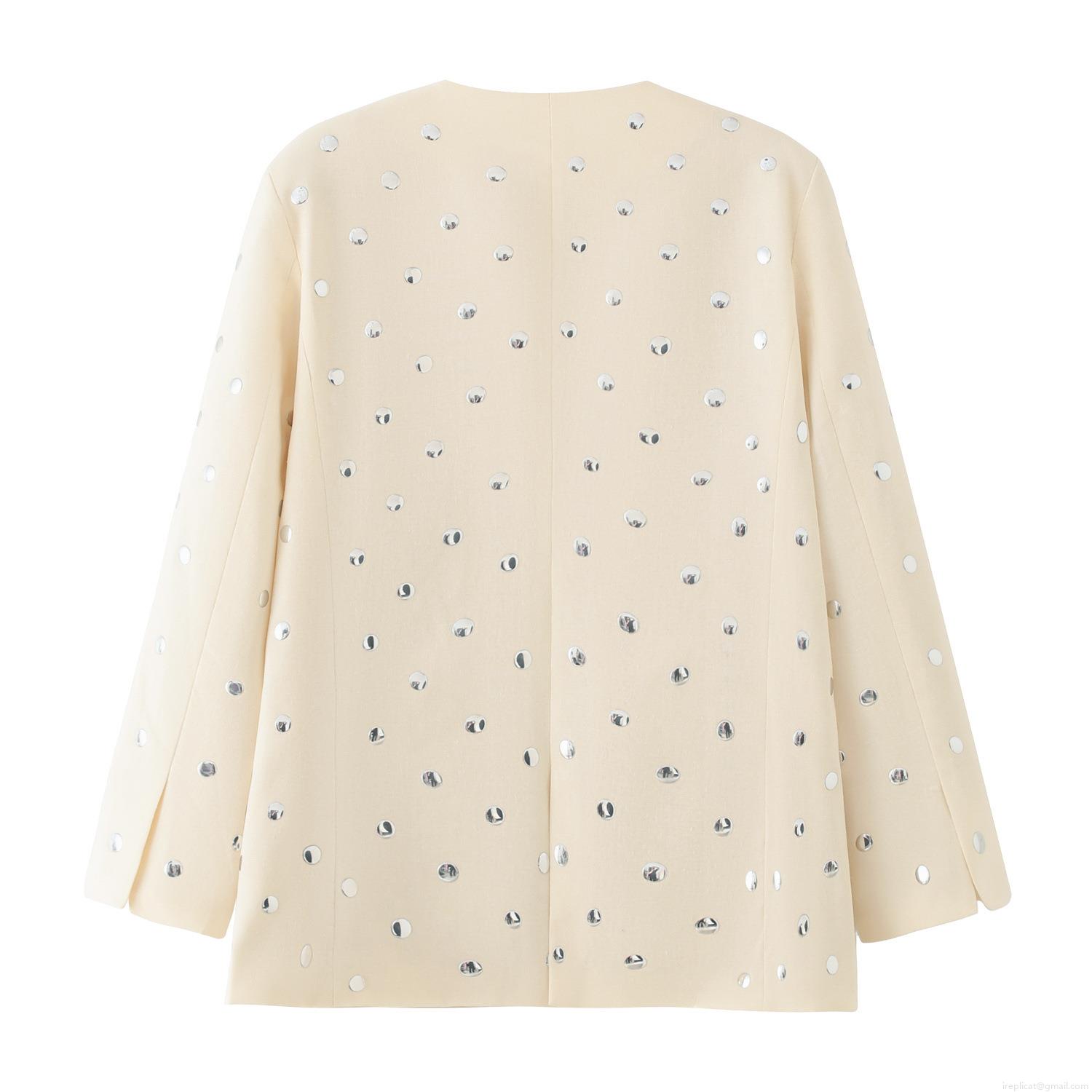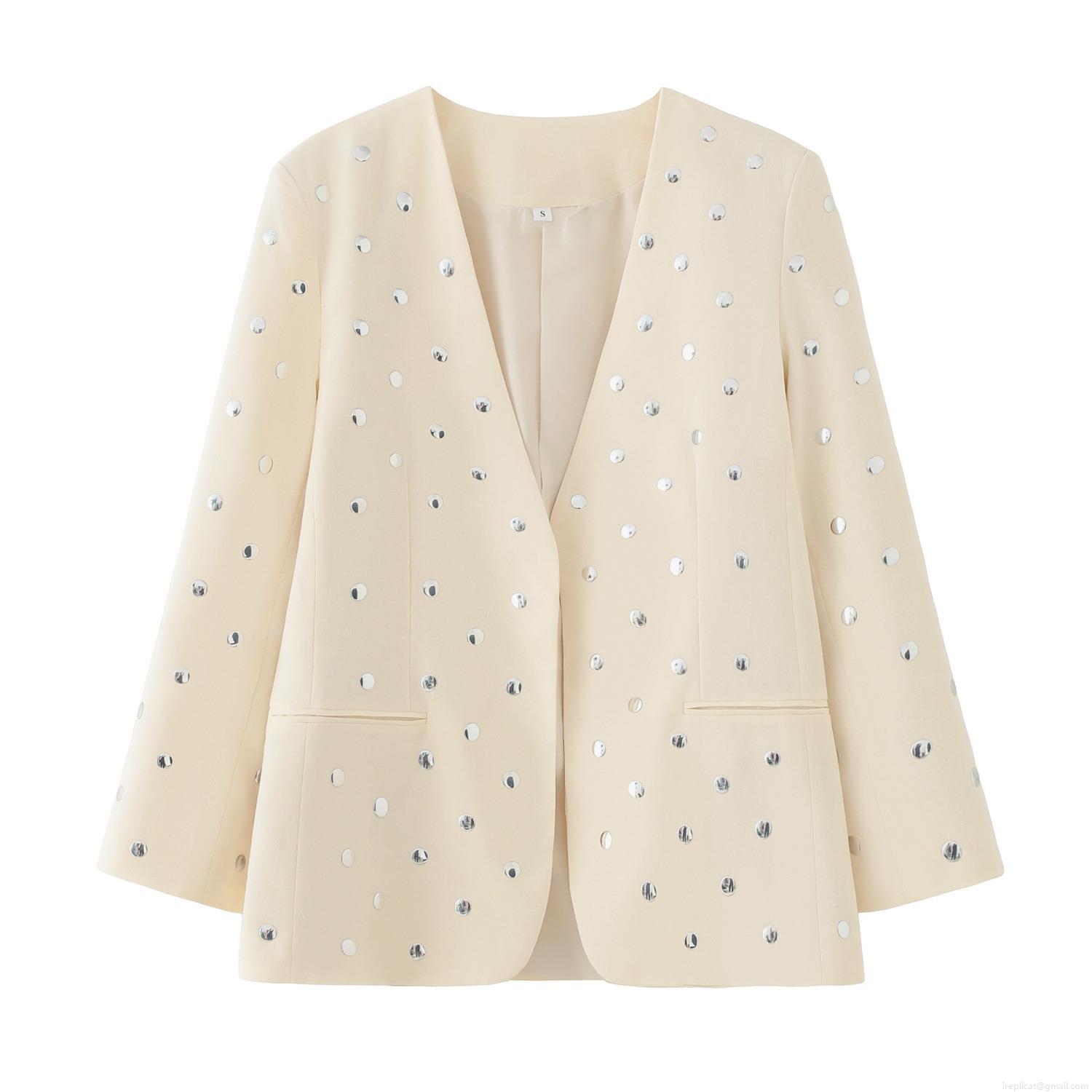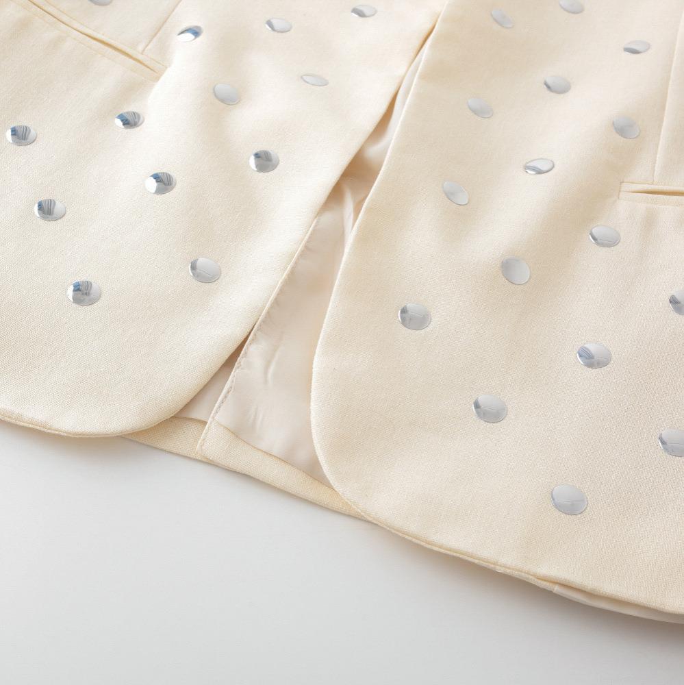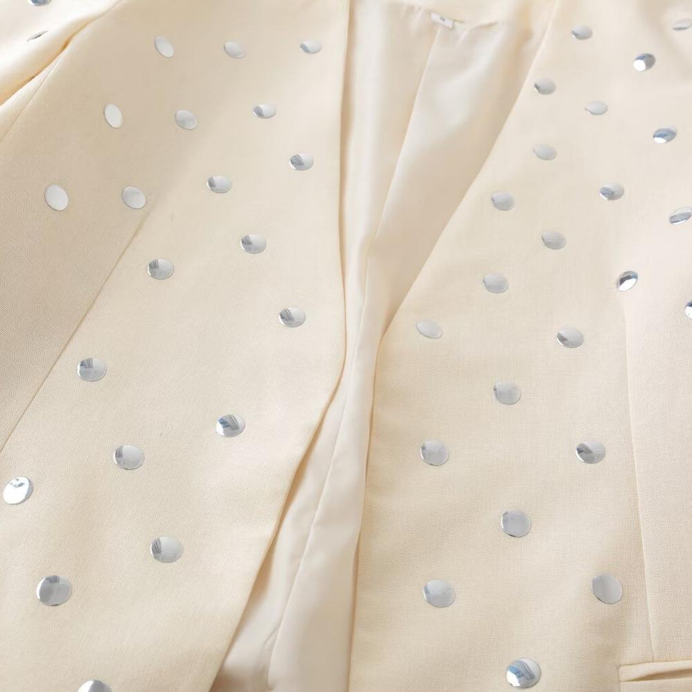 • Women's Elegant Creamy White Blazer Jacket With Silver Metal Rivets Sequins 100% Polyester Open Front Long Sleeve Office Commuter Suit For Ladies