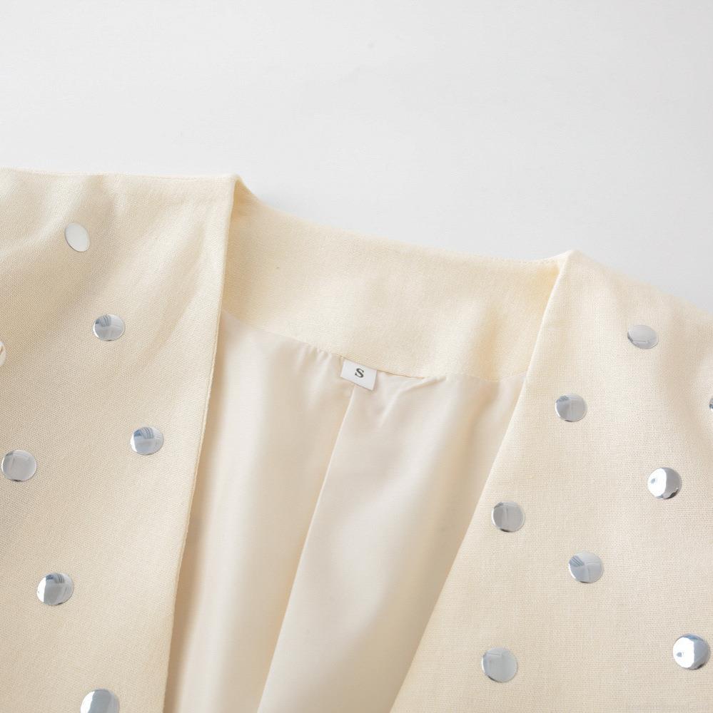 Women's Elegant Creamy White Blazer Jacket With Silver Metal Rivets Sequins 100% Polyester Open Front Long Sleeve Office Commuter Suit For Ladies