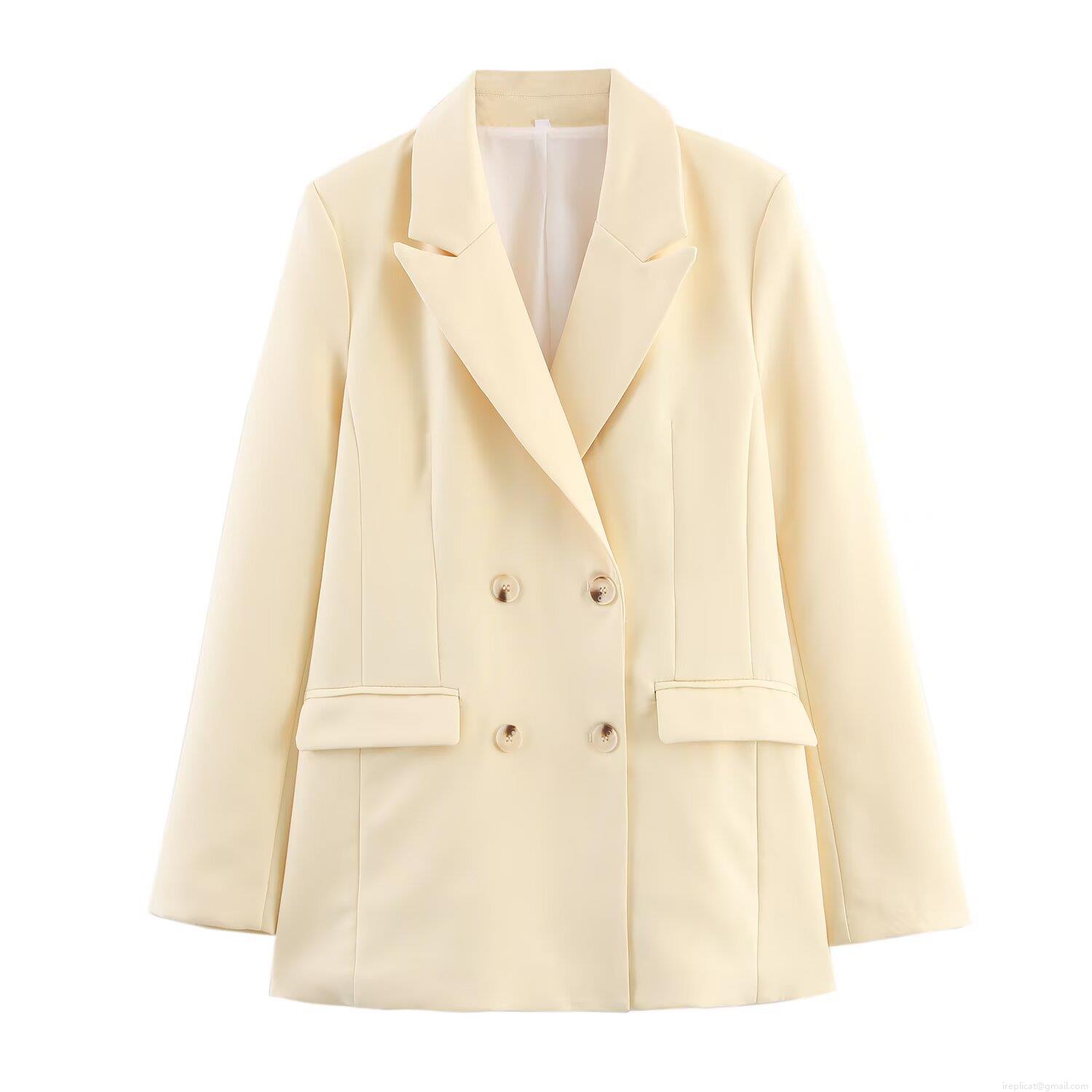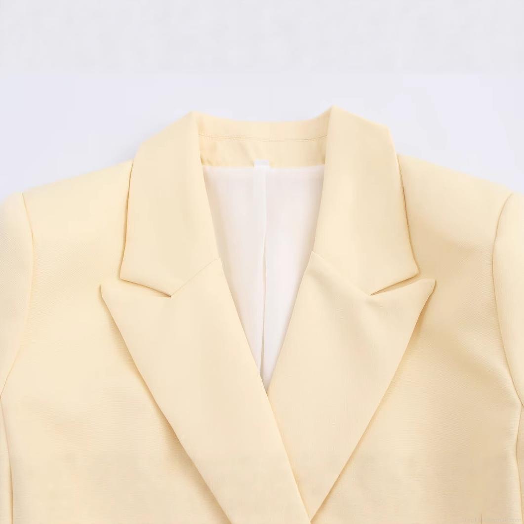 • Women's Elegant Double-Breasted Blazer Jacket Solid Light Yellow Polyester Notched Lapel Mid-Length Outwear For Office Business Casual Commute