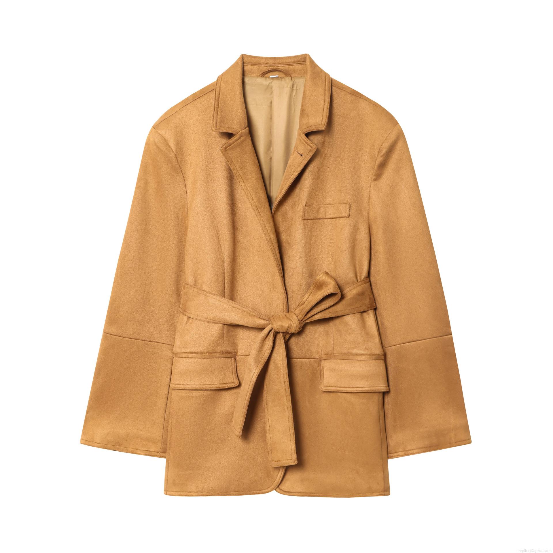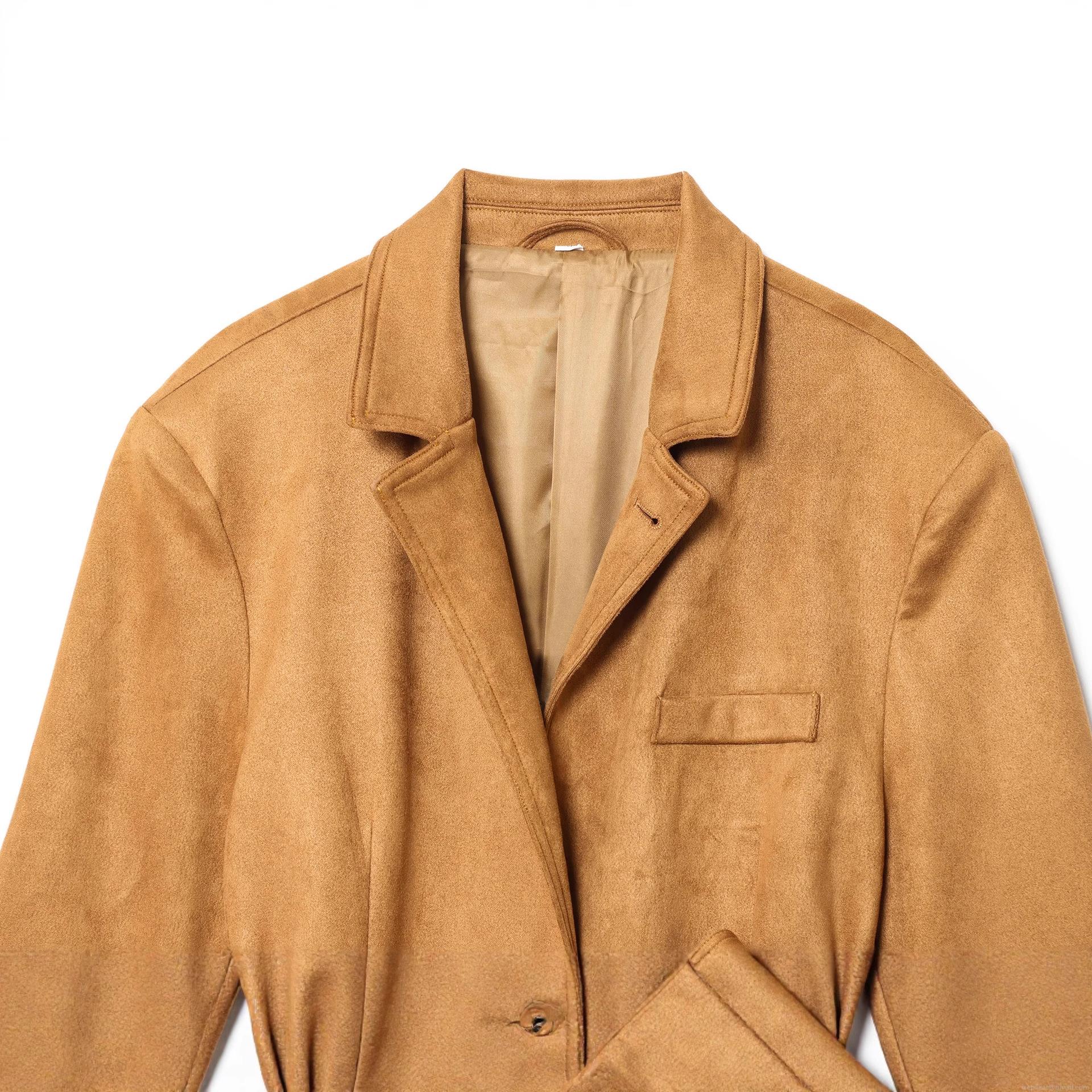 • Women's Elegant Faux Suede Blazer Jacket With Tie Waist Belt Camel Bronze Solid Color Long Sleeve Mid Length Lapel Collar Coat For Casual Daily Commute Office Outerwear